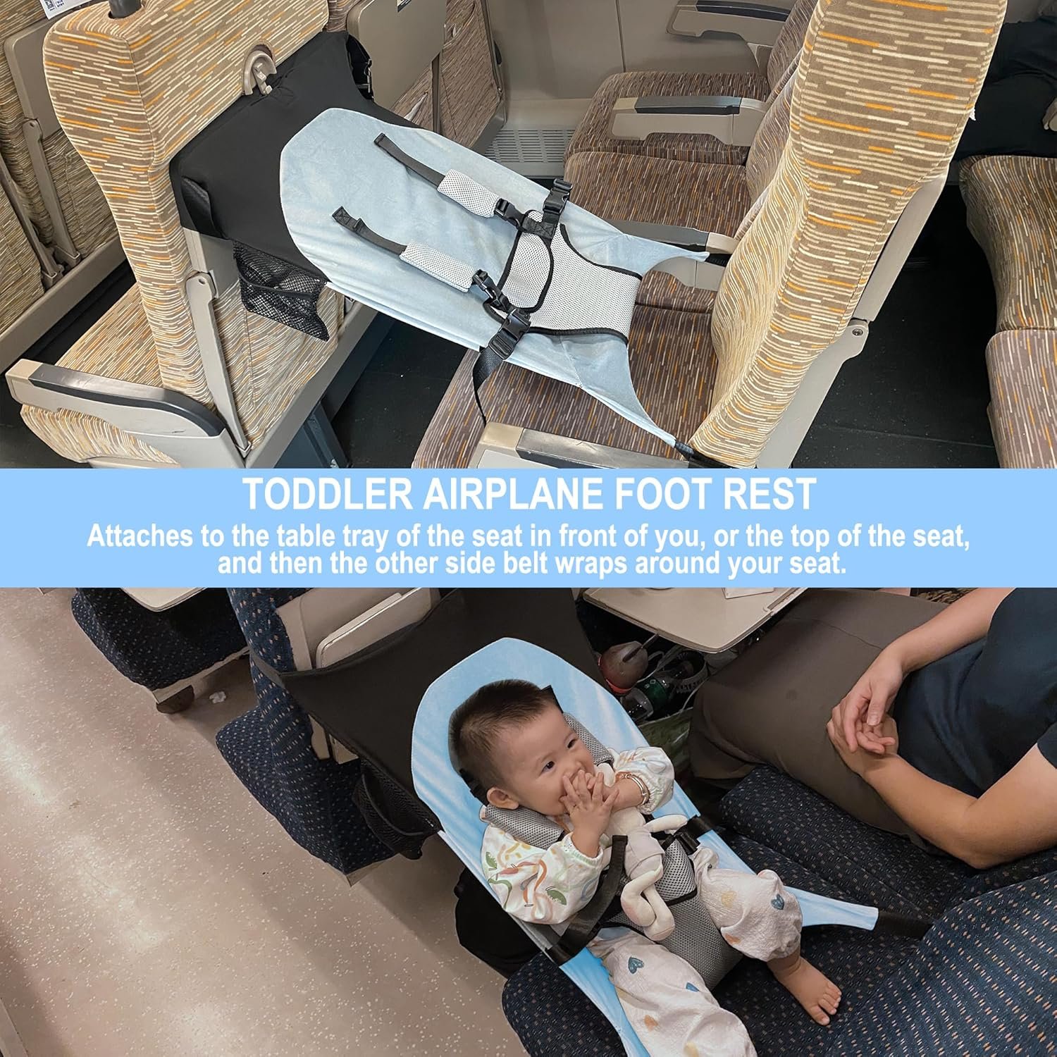 🛫[Easy Installation, Suitable for All Airplane Seats]: The baby airplane travel essentials bed attaches to the table tray on the back of the seat in front of you and then wraps around your waist. The crib forms between the seat and your waist creating a front-facing sling-type seat for infants. You can fix the top of the seat with the adjustable braided belt at the top when without the tray table.