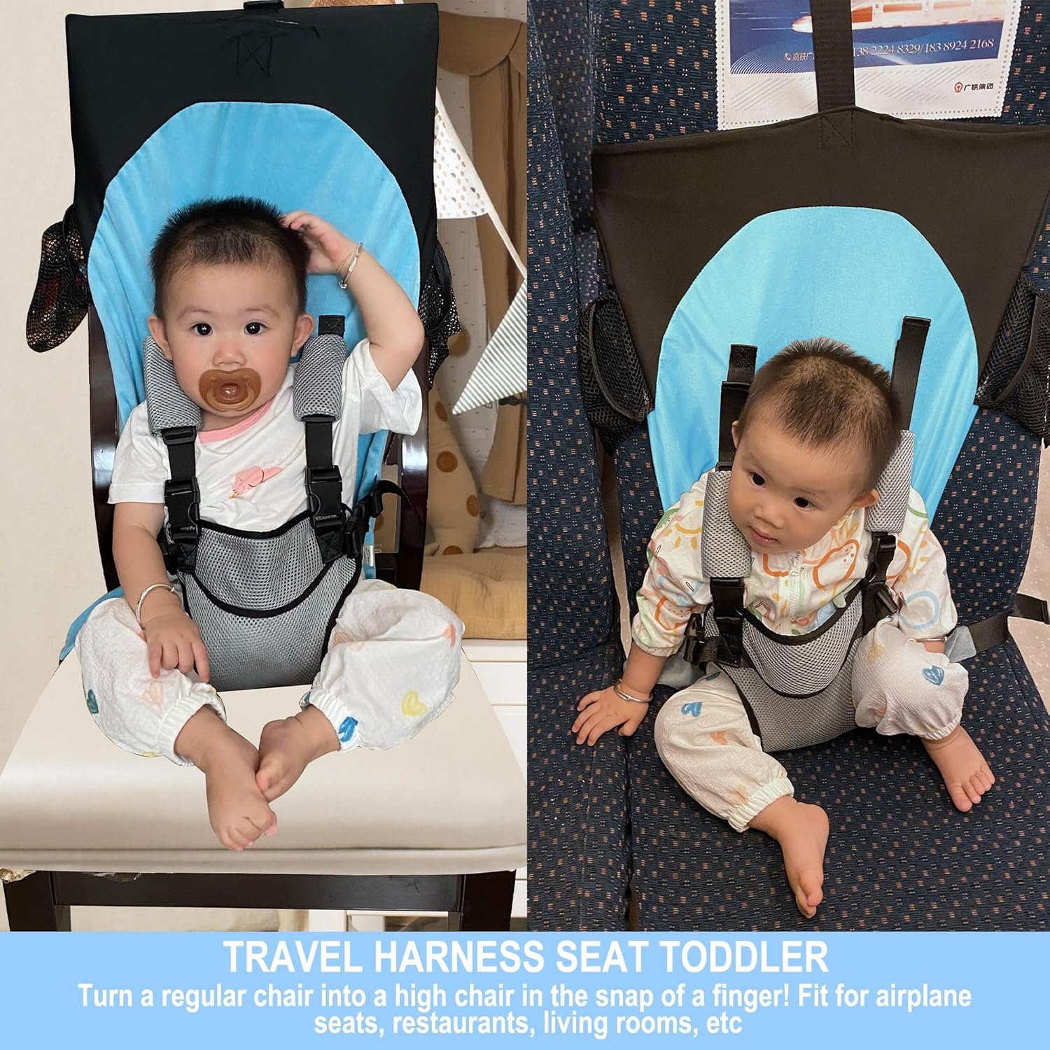 🛫[Suitable for All Flights]: The top pocket is inserted into the front table tray, or the belt at the top is sleeved on the seat. The other side of the belt is tied around your seat or waist, becoming a baby bed. You can also use it as a high chair harness seat in airplanes, at home, or the dining room seat.