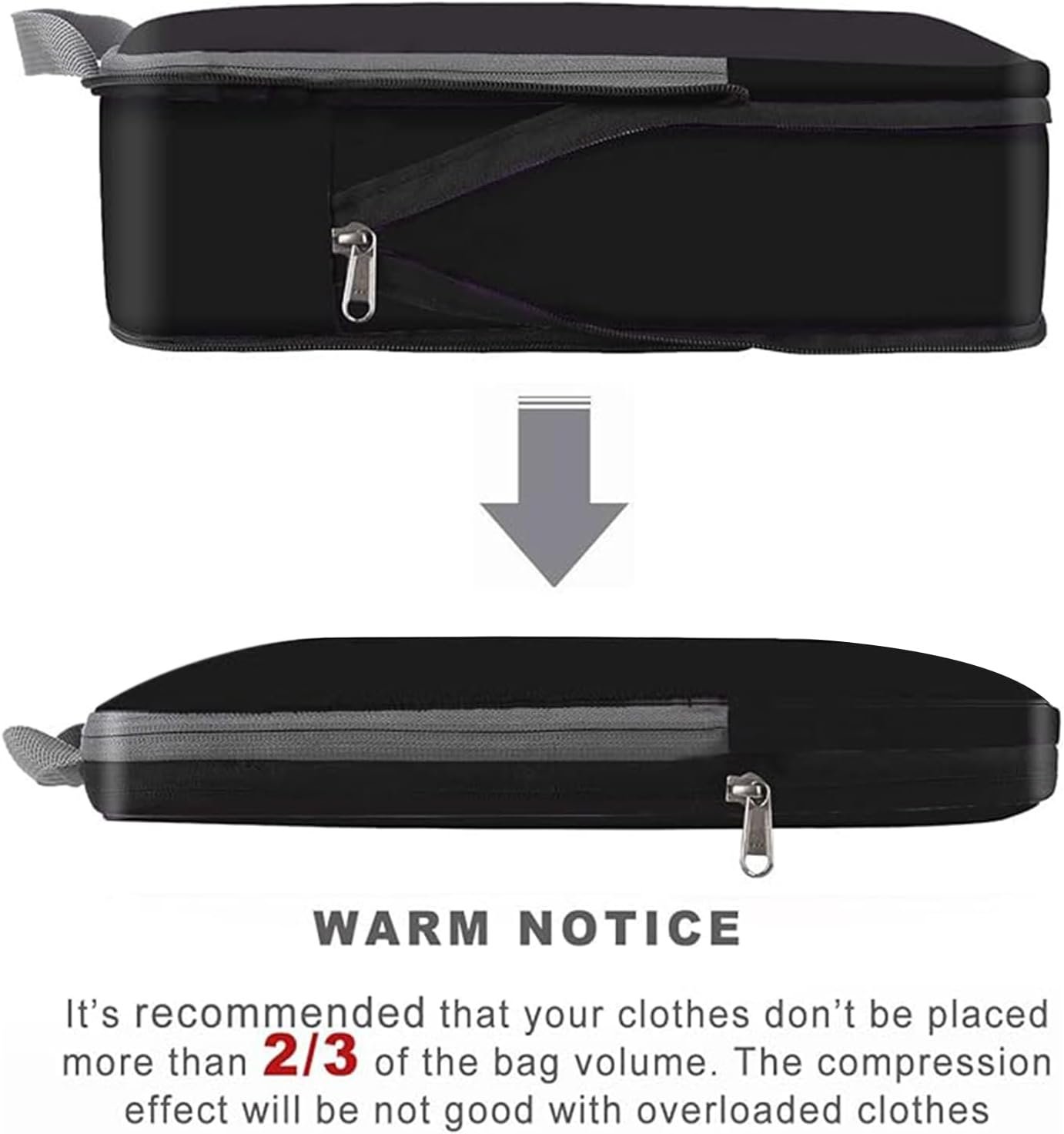 How to Compress:The cube is compressed by the middle zipper; Using steps: 1)Fold and flatten clothes 2)Pack clothes in the cube and zip the front zipper 3) Put a finger on the back of the middle zipper when compressing to avoid zipper get stuck in fabric