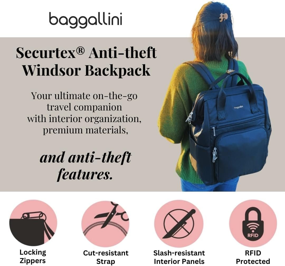 Baggallini Securtex Anti-Theft Windsor Backpack for Travel, Work & Collage, RFID & Locking Zipper, Up to 16″ Laptop