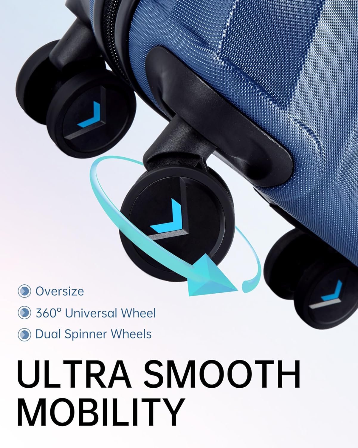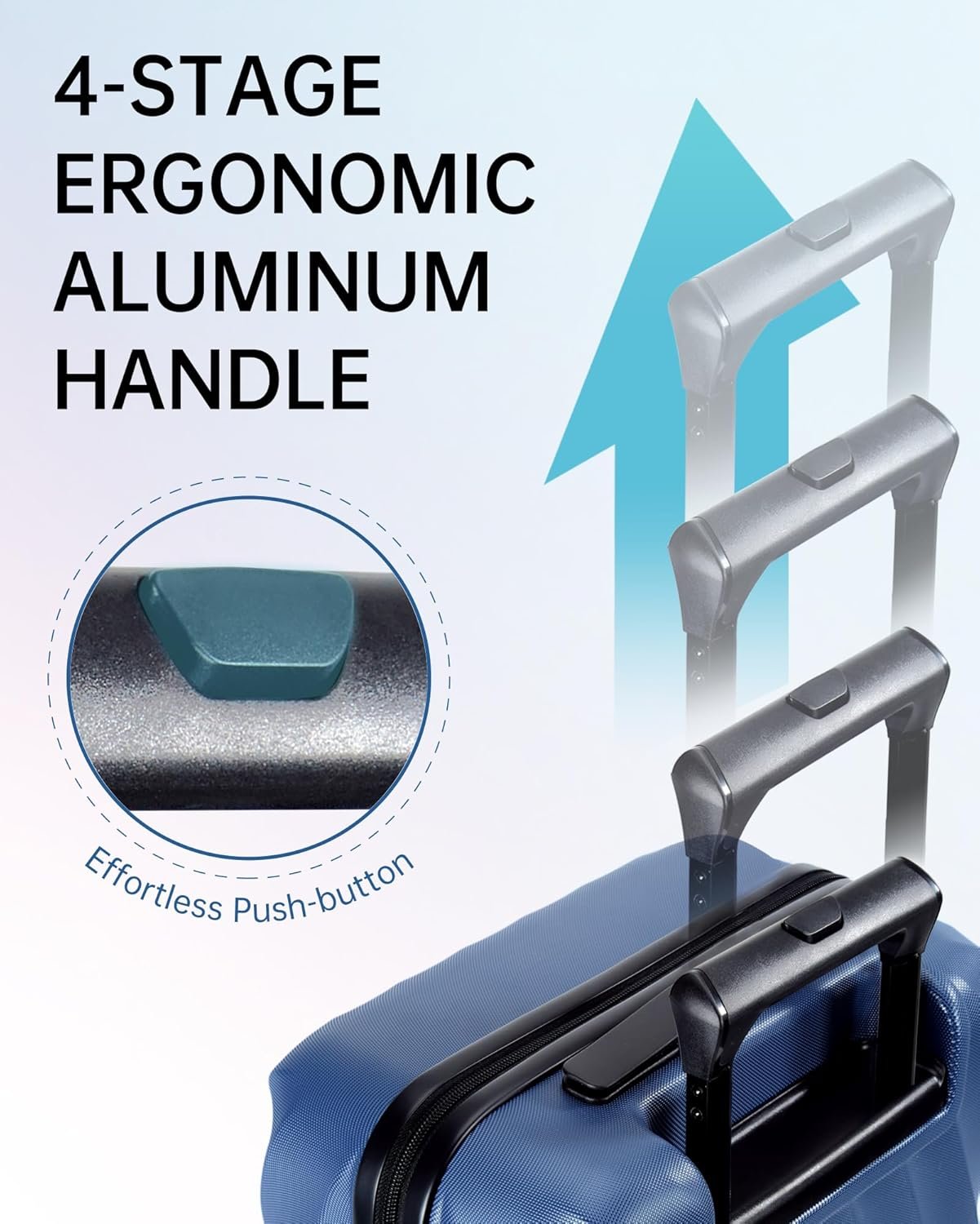 EASILY MANEUVERABILITY – 360° spinner dual wheels roll smoothly over multiple surfaces, like carpet, rougher terrain even gravel, and handle bumps yet tight corners well. The extension handle is molded for comfort and durable, which is made from aluminum and can be adjusted four-stage to suit different heights. TSA approved combination lock to keep your belongings safe and secure be opened by security customs easily (The combination lock preset to 0-0-0. No key included in this luggage)
