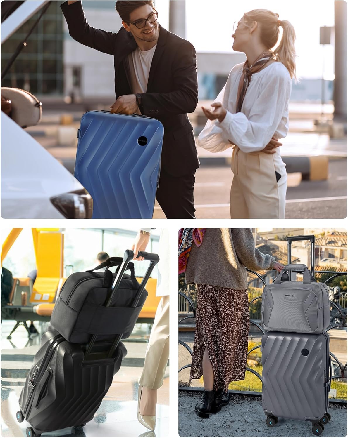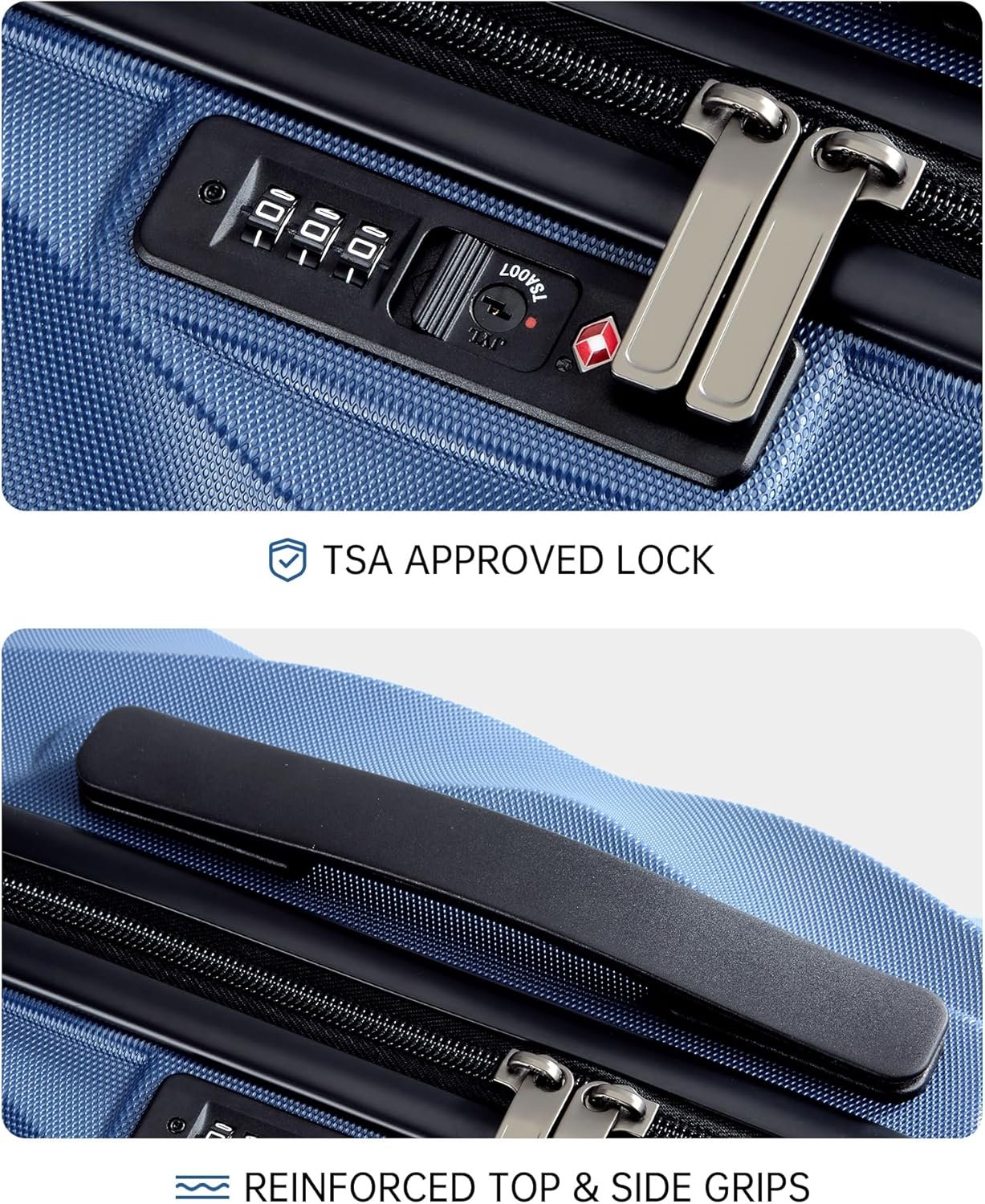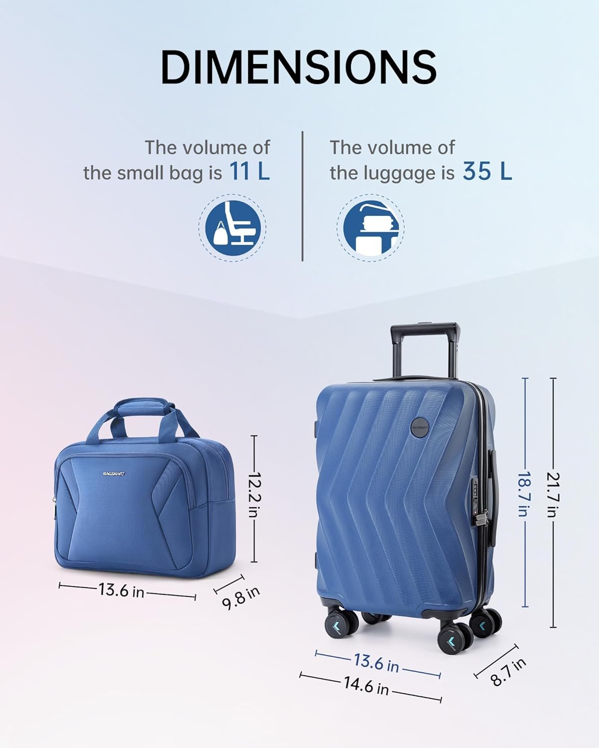 COMPACT CARRY ON SIZE- Airline approved carry on luggage fits in overhead bins of most major domestic airlines while allowing for more packing capacity. 20 inch luggage is suitable for 3-5 days travel, airplane, train and car trips alike. Lightweight carry on allows you to make better use of weight allowance without any effort. Dimension: 21.7 x 14 x 8.7 in (wheel and handle height included). Volume: 35 L. Weight: 6.39 lbs