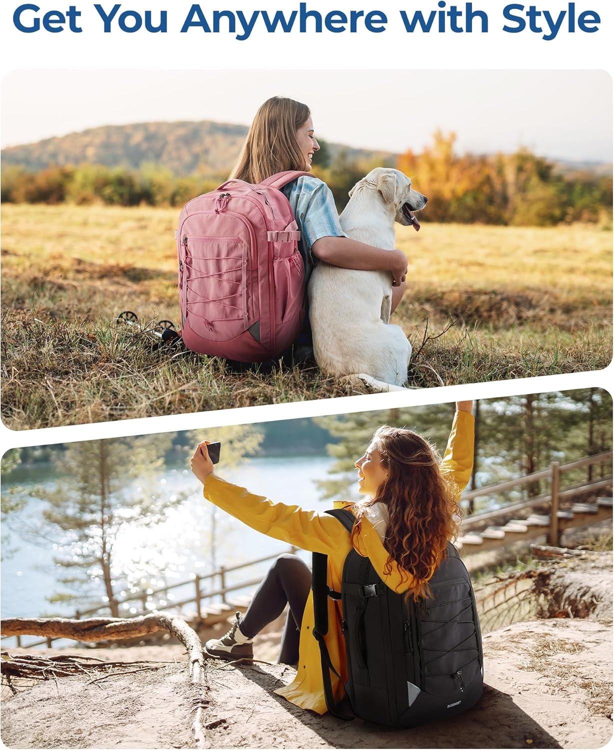 Large Capacity & Multiple Pockets: The travel backpack features 4 spacious compartments to accommodate both daily essentials and travel necessities. Its main compartment offers ample room, holding 5-8 articles of clothing, books, and other items. The separate laptop compartment comfortably fits a 17″ laptop. Additionally, the carry on backpack for women has multiple pockets and an elastic cord system, ensuring organized storage and providing extra space for your belongings.