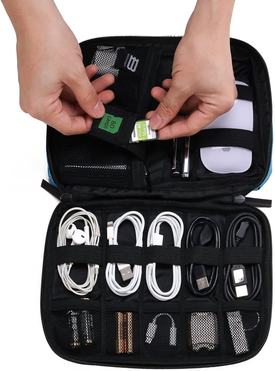 Compatible Space: The electronics organizer bag keeps all gadgets in one place, 5 elastic loops(S) for slender cables, earphones, or pens, 2 elastic loops(L) for longer cables or computer mice, 1 mesh zippered pocket, 5 elasticized mesh segments, and pocket under the zippered pocket to store chargers, USB drives, power banks, USB-C hub, dongles