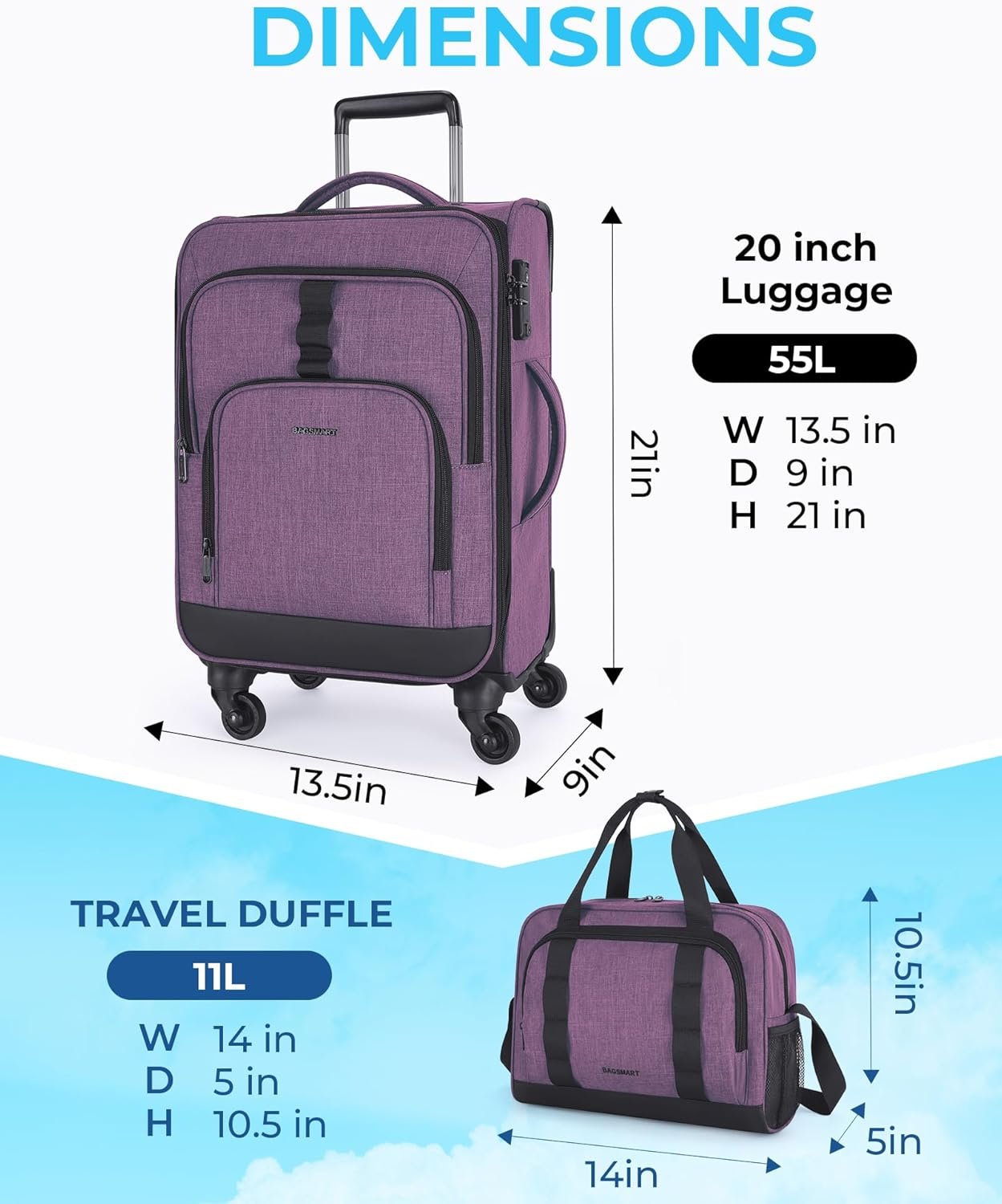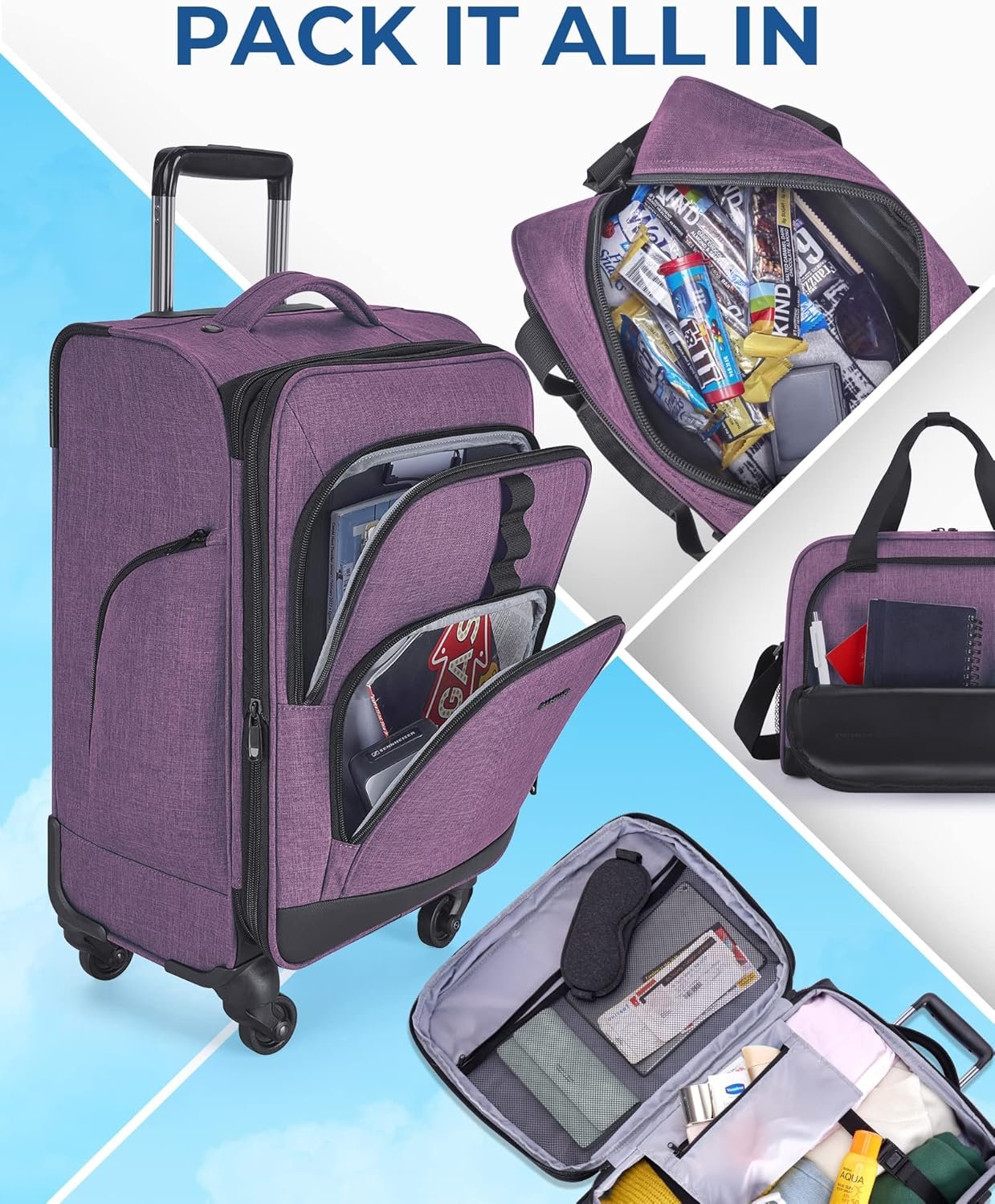 BAGSMART Expandable 20 inch Carry on Luggage Airline Approved, Lightweight Carry on Suitcase with Spinner Wheels, Family Travel Suitcase Set with Duffle Bag – Purple