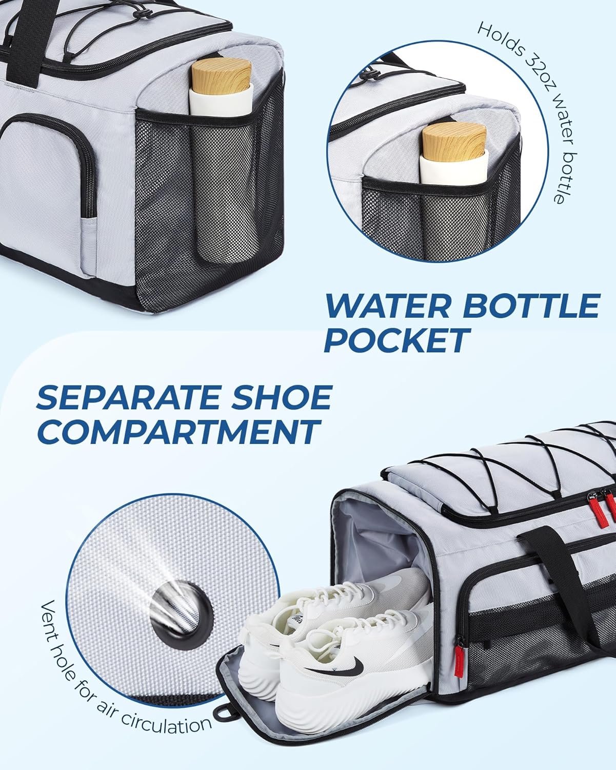 Versatile Functionality: Our sports bag is equipped with functional pockets on both sides, including an independent shoe compartment and a water bottle pocket. The breathable design of the shoe compartment ensures proper air circulation, keeping your shoes fresh. The water bottle pocket securely holds a 32oz bottle, ensuring you stay hydrated during workouts or travels