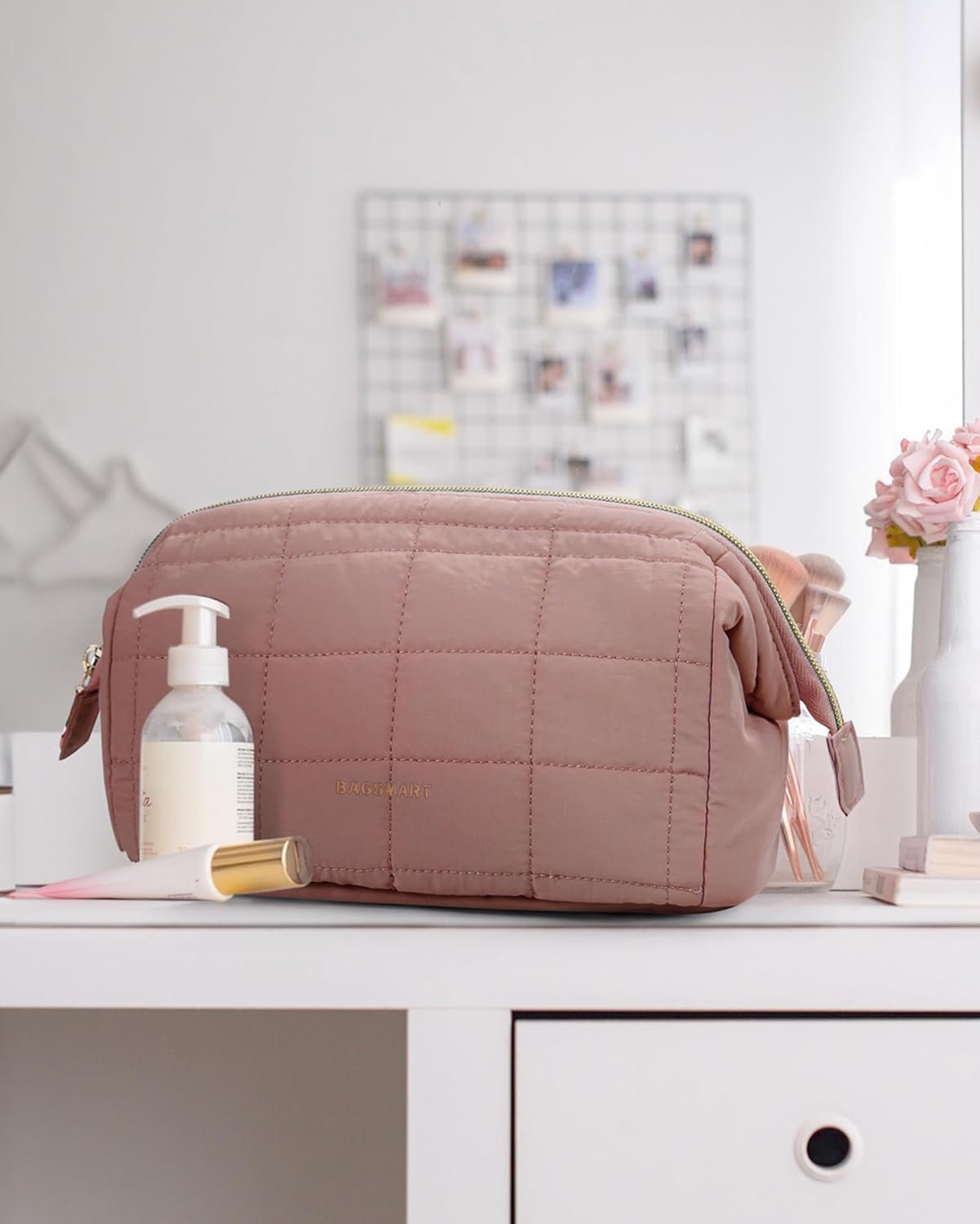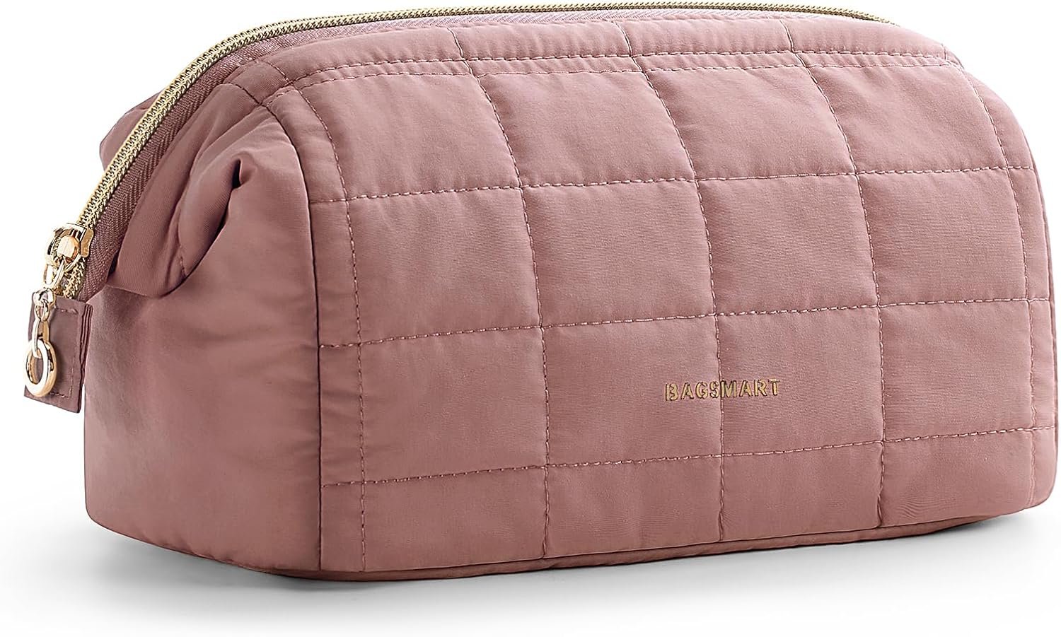 BAGSMART Makeup Bag Travel Toiletry Bag, Puffy Padded Make Up Bags for Women Makeup Organizer Case, Wide-open Pouch Purse Travel Essentials Toiletries Accessories Brushes, Dark Pink