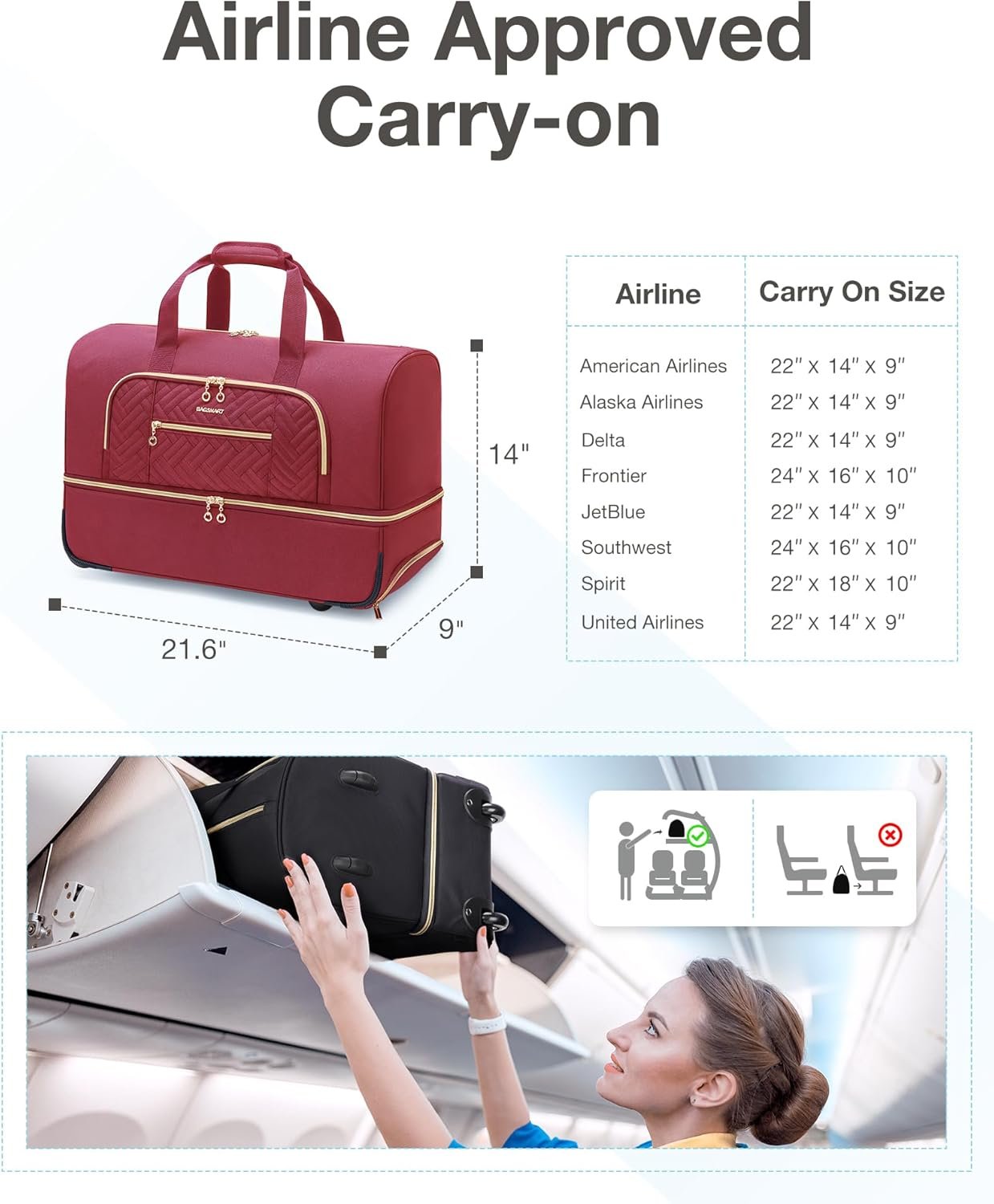 Airline Approved: The size of rolling duffel bag is 21.6″(L) x 9″(W) x 14″(H), it can be a carry-on for most airlines. It fit into the overhead compartments just fine