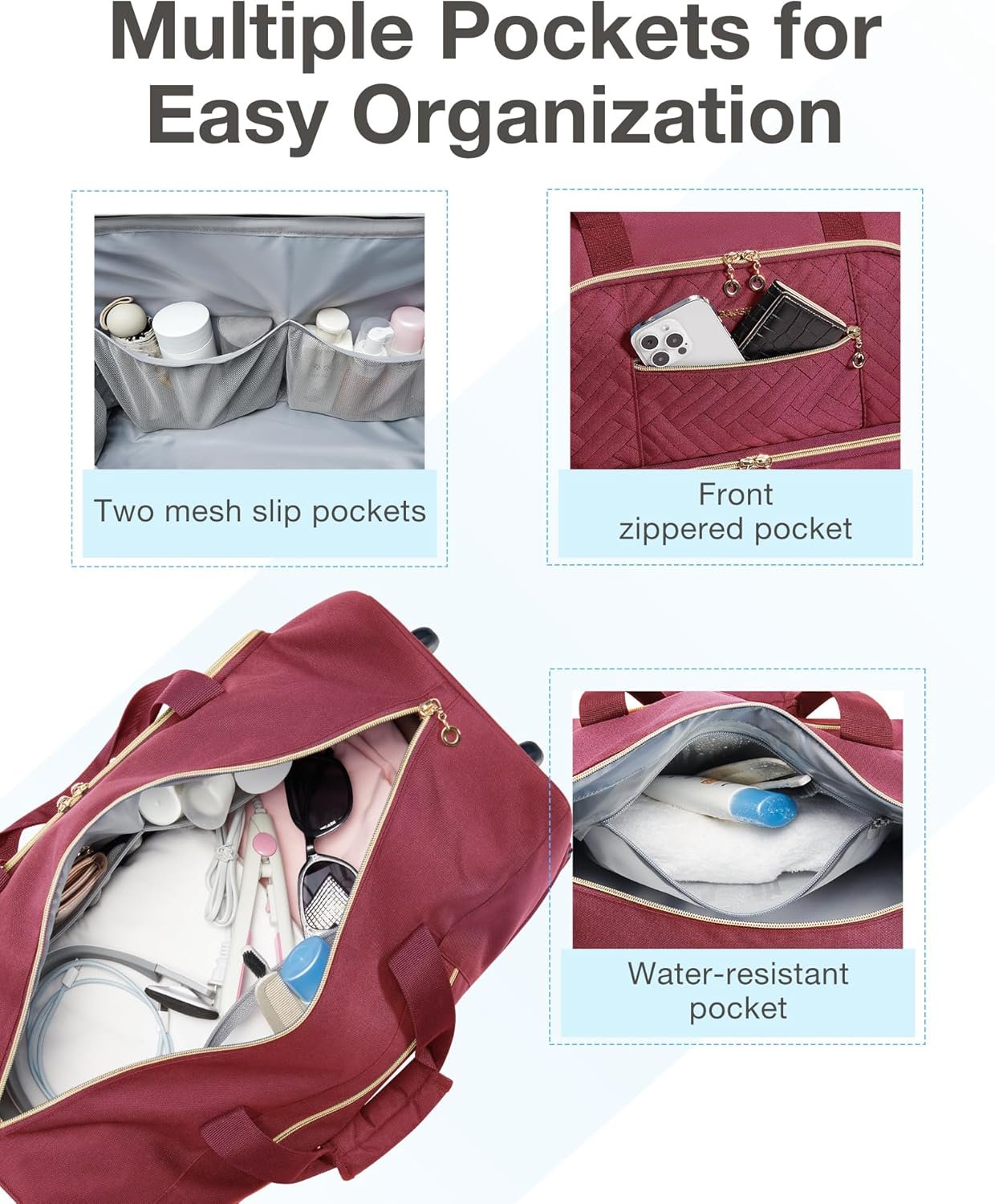 45L Large Capacity: With spacious internal space and multi-pockets, it was very deep, roomy, spacey. This travel duffel bag adopts Large top opening, which is convenient for quickly getting items. It made it easy to stay organized. It is also equipped with 1 wet pocket+2 mesh slip pockets+2 front pockets for storing daily necessity. It can meet travel of at least 5 days