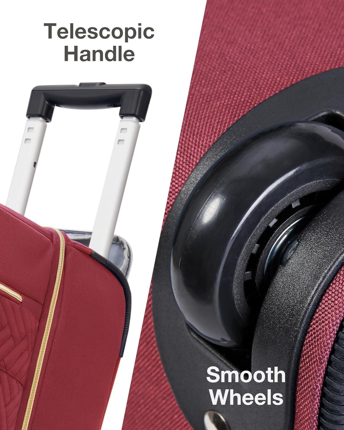 The exterior of this soft-sided rolling travel bag is designed with unique metal elements to give your travels a stylish touch. Made of heavy-duty polyester fabric, the bag is waterproof and abrasion-resistant.2 wheels provide excellent mobility to get you through airports with ease. With a retractable hidden handle system on the side and a large opening for easy access to the spacious zippered, fixed main compartment. 2 front zipper-secured compartments to protect your personal belongings from getting lost. Ergonomic padded carry handles ease your travel carrying burden.