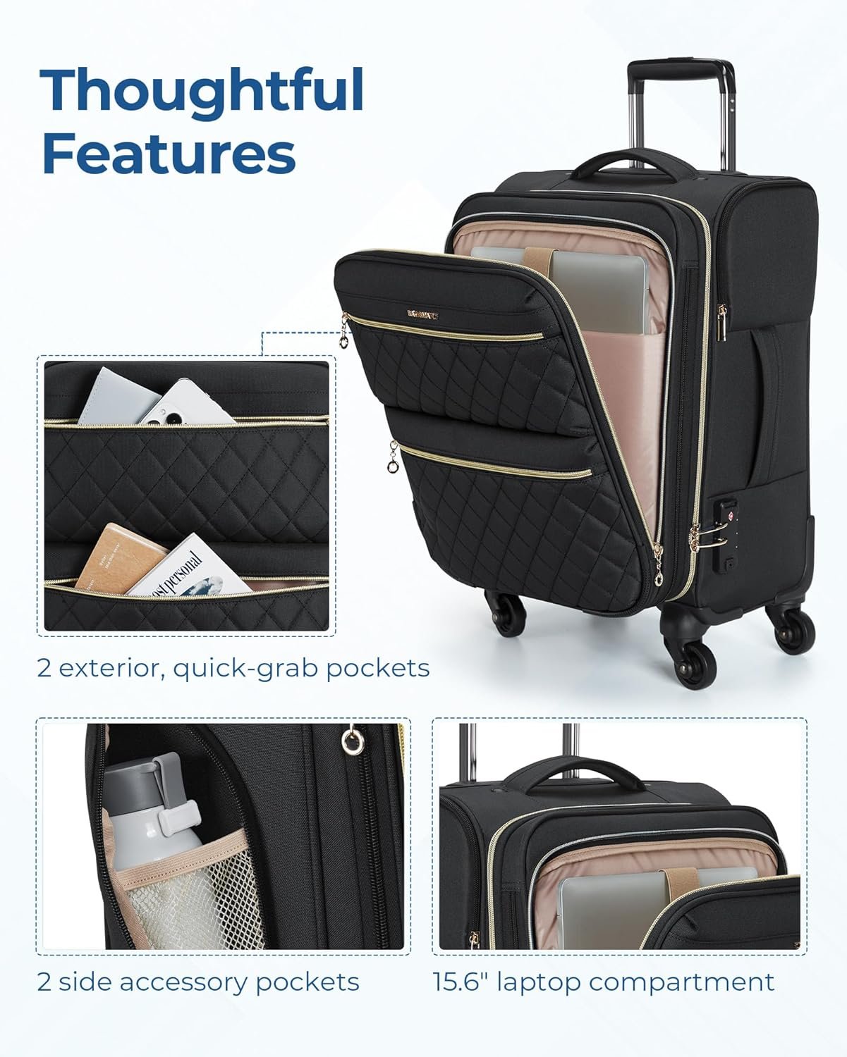 Getting Around Is Easy: The luggage carry on spinner wheels comes with an ergonomic Grade 3 aluminum tubular handle and is available in a variety of heights while minimizing wobble for your comfort. With 360° swivel wheels, suitcase for women is quiet and durable, making it easy to navigate airports, train platforms, sidewalks, and more. The Womens luggage made of quilted durable polyester fabric offers a sturdier base that allows it to glide easily, even when fully loaded.