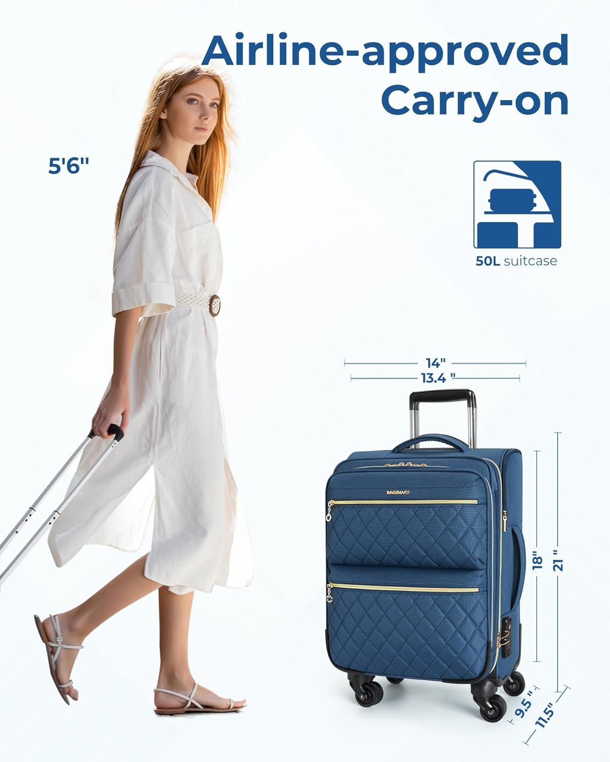 BAGSMART Softside Expandable Luggage Airline Approved with Spinner Wheels, 20 Inch Carry On Luggage 22x14x9 with TSA Lock, Quilted Rolling Suitcases for Women, Navy Blue