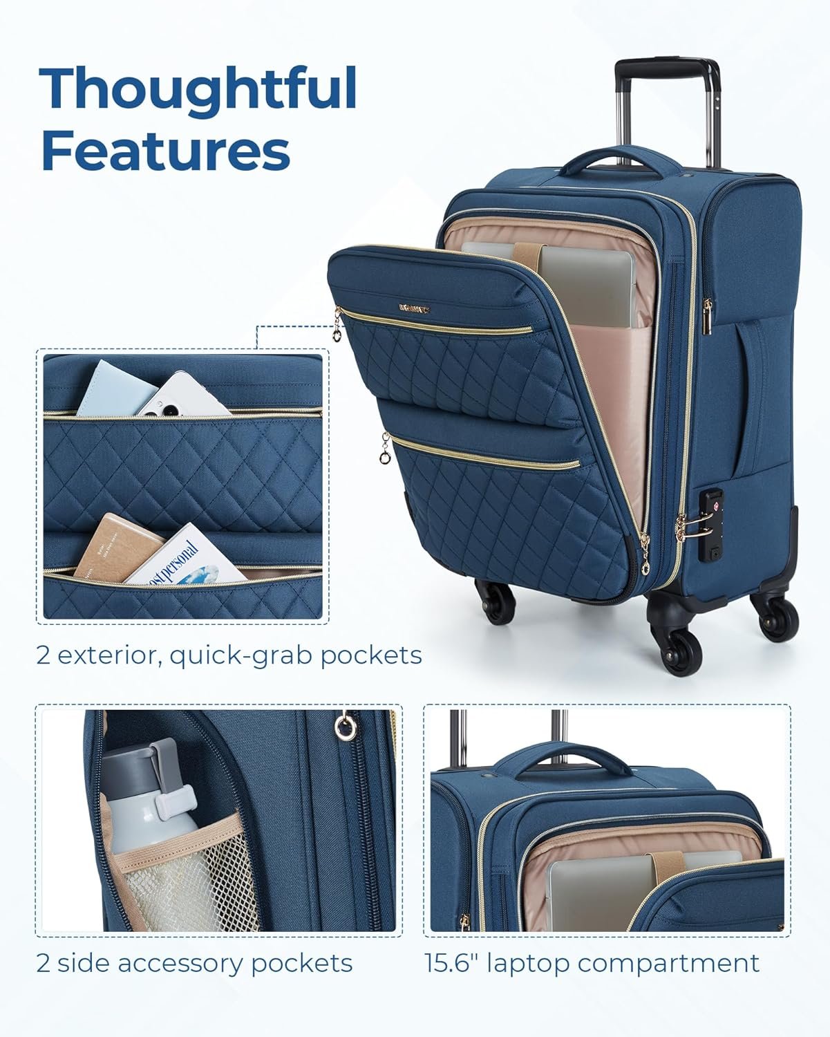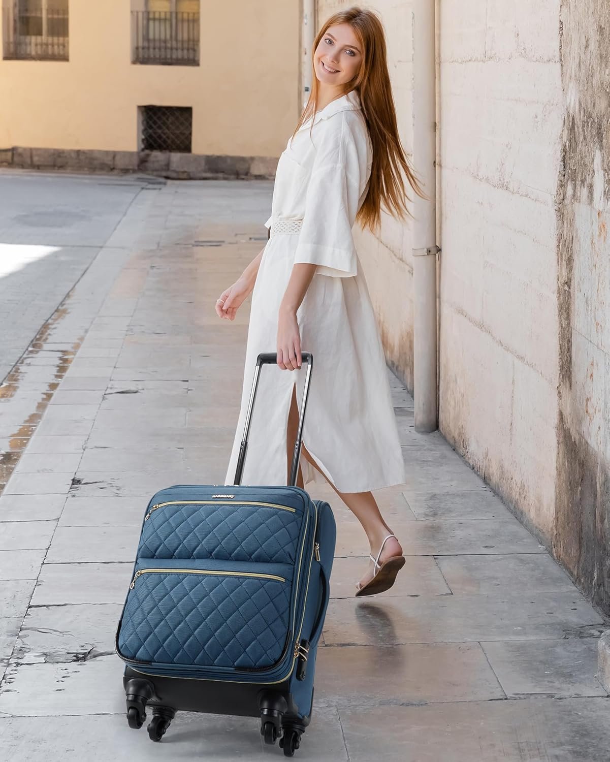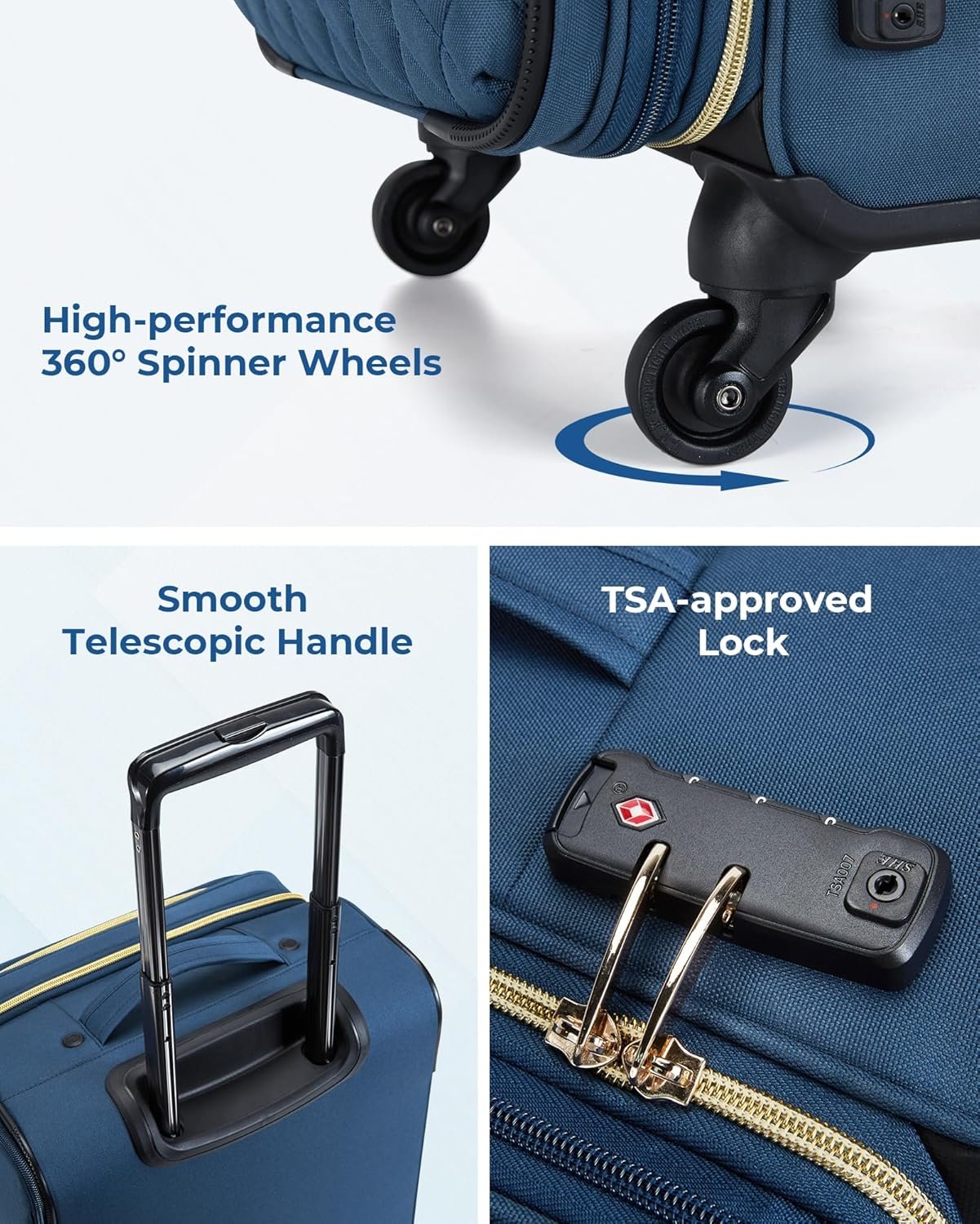 Getting Around Is Easy: The luggage carry on spinner wheels comes with an ergonomic Grade 3 aluminum tubular handle and is available in a variety of heights while minimizing wobble for your comfort. With 360° swivel wheels, suitcase for women is quiet and durable, making it easy to navigate airports, train platforms, sidewalks, and more. The Womens luggage made of quilted durable polyester fabric offers a sturdier base that allows it to glide easily, even when fully loaded.