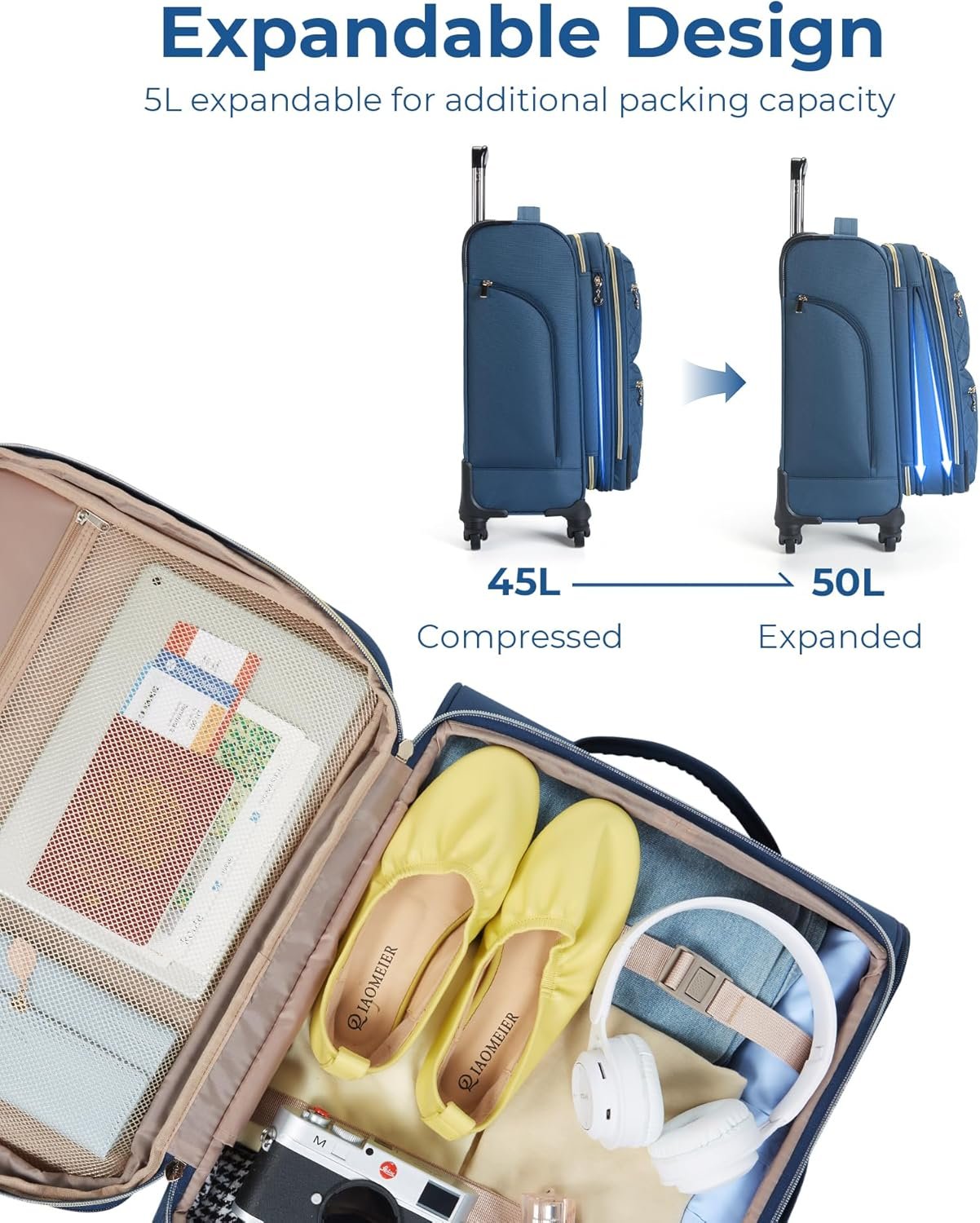 Upgraded 11% Bottom Expandable Design: The softsided expandable luggage unzips to expand by 2 inches at the bottom, providing 45L and an additional 5L of expanded capacity. The interior of the carry on suitcase has huge main compartments with a buckle compression system to keep your travel items organized. The interior of the suitcase with wheels comes with a zippered utility pocket for small items. Travel luggage expands to a massive 50L capacity to help you hold all your travel essentials.