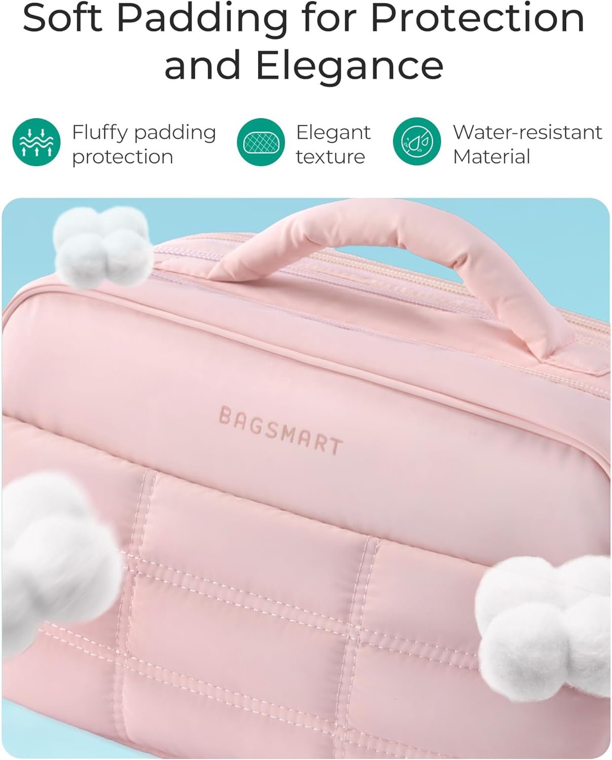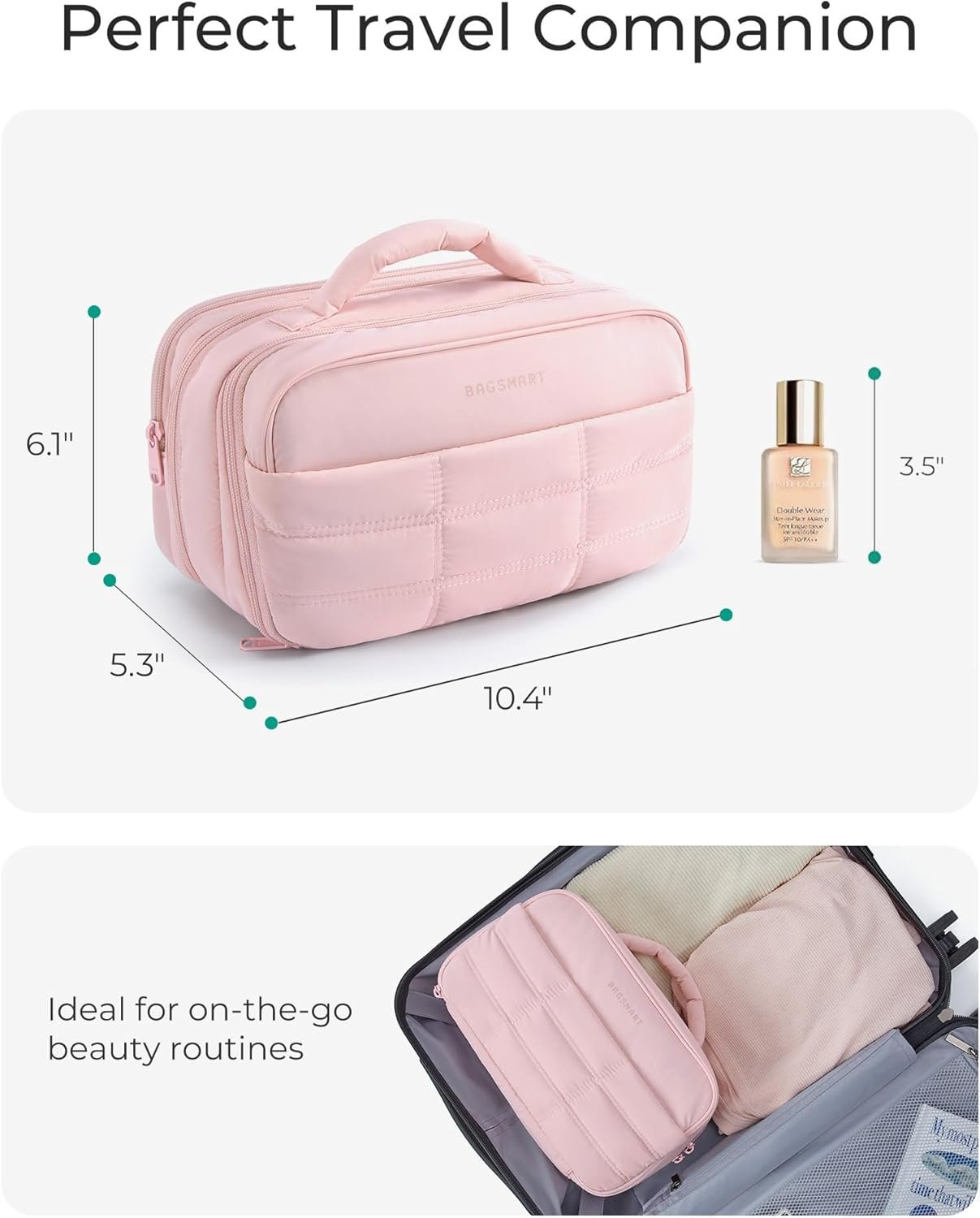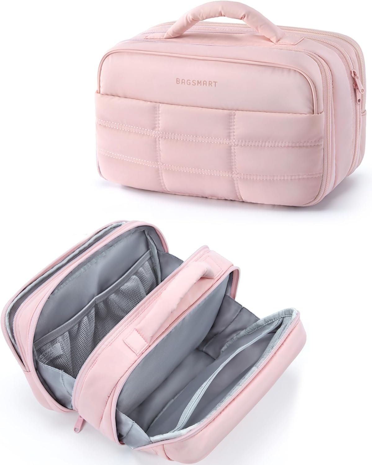 BAGSMART Toiletry Bag for Women, Travel Makeup Bag, Wide-open Portable Make Up Bag Organizer for Women for Travel Essentials Travel-Size Toiletries Accessories Bottles, Brushes, Pink