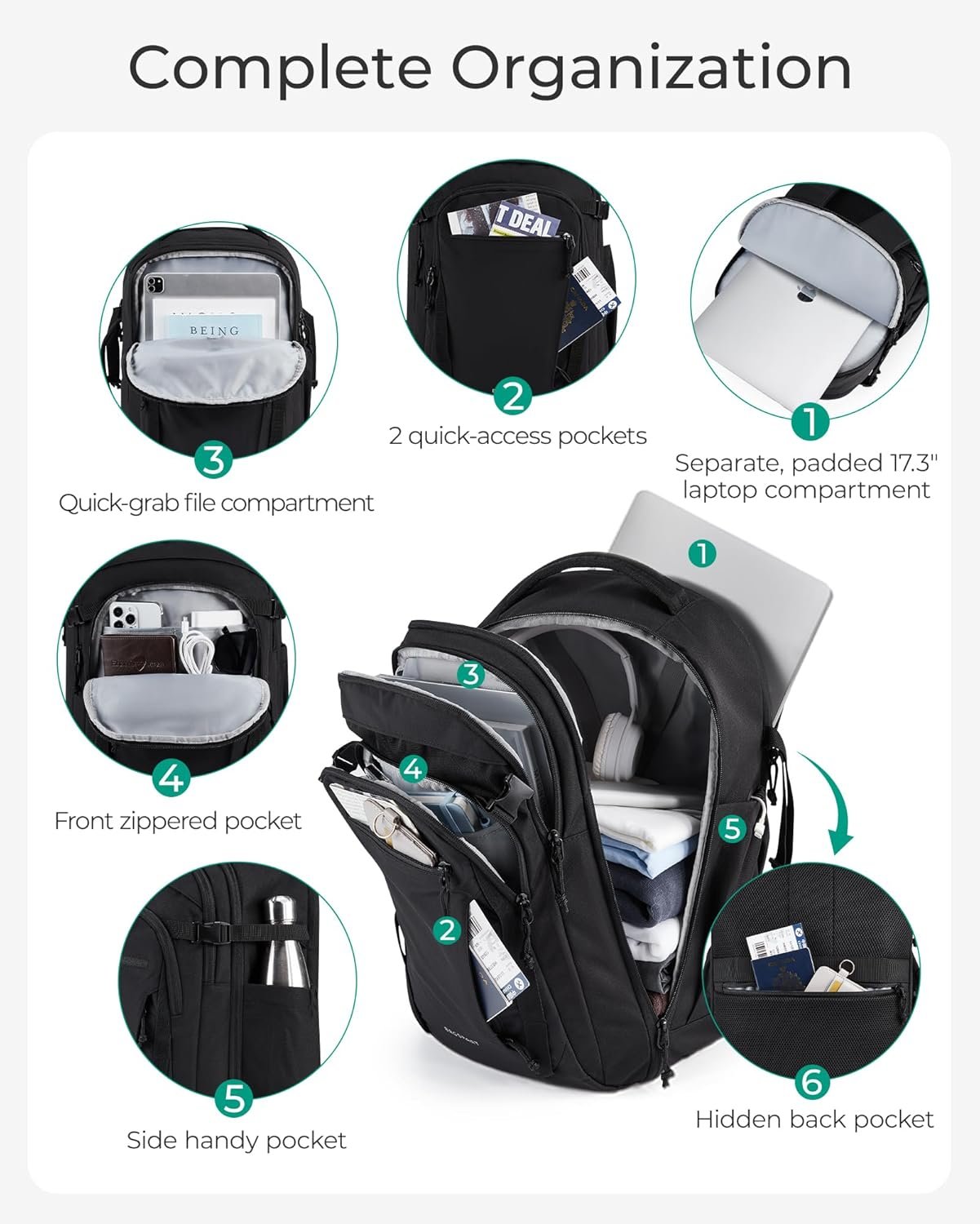 Travel Convenience Redefined: Clamshell backpack 180° opening of this travel backpack for men, women ensures effortless packing and organization. The spacious main compartment can hold outfits for 3-7 days, while a specialized wet/dry pocket keeps toiletries neatly separated.Dedicated compartment fit up to 17.3-inch laptop. The anti-theft back pocket provides added security for your valuables. The front slip and file pocket for quick accessm, and a side pocket water bottle or umbrella