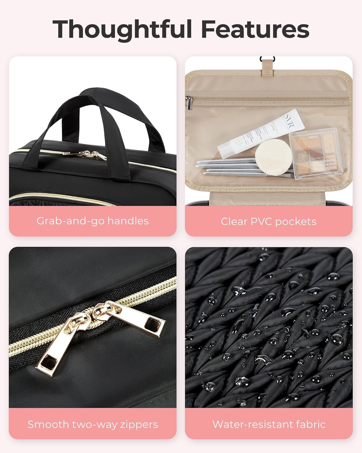 𝐄𝐥𝐞𝐠𝐚𝐧𝐭 𝐤𝐧𝐢𝐭𝐭𝐞𝐝 𝐃𝐞𝐬𝐢𝐠𝐧: Hanging toiletry bag’s front pocket features an elegant knitted design, making the bag more fashionable, cute, and attractive