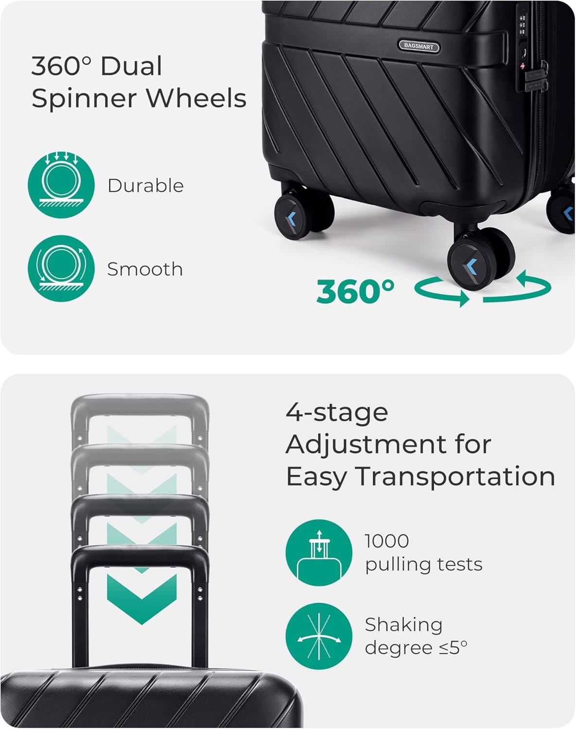 Premium Service And Warranty: BAGSMART will back each piece of tsa approved carry on luggage with a 5-year manufacturer’s warranty. Before shipment, hard side luggage with spinner wheels undergoes thousands of rigorous tests to ensure that our carry on suitcase meets strict standards and can withstand any journey. If there is any quality problem, please feel free to contact us. Professional and patient customer service will reply to your satisfaction in time.