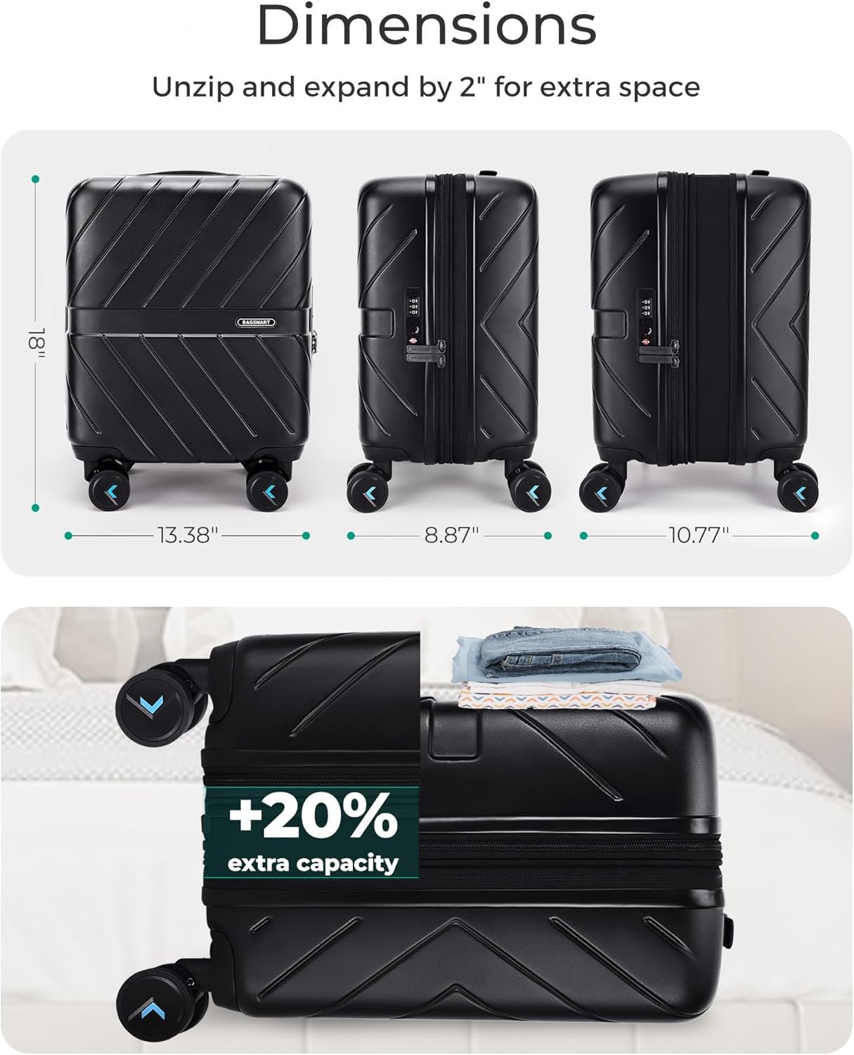 Room For More: BAGSMART hard case suitcase is designed to fit more into your trip. The 2 main compartments of travel luggage with compression cross straps store all your clothes and belongings and keep clothing wrinkle-free, items neatly in place. Individual built-in small pocket is for small items. Generously sized, thoughtfully placed designs maximize every inch of storage, meaning you can get more out of every trip with your carry-on.