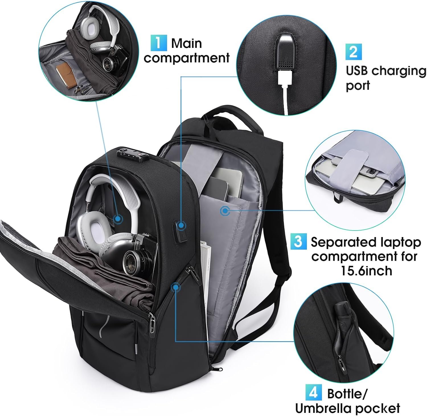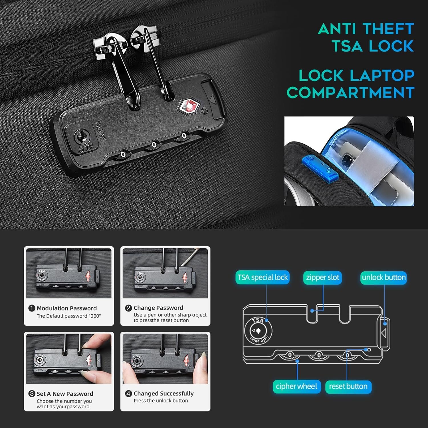ANTI THEFT BACKPACK: The computer backpack is equipped with a smart secure lock that is made of high strength zinc alloy with a solid, compact body to prevent theft and well safeguard all your valuables securely. The password lock is easy to set (Includes instructions), please see A+ for the detailed instruction.