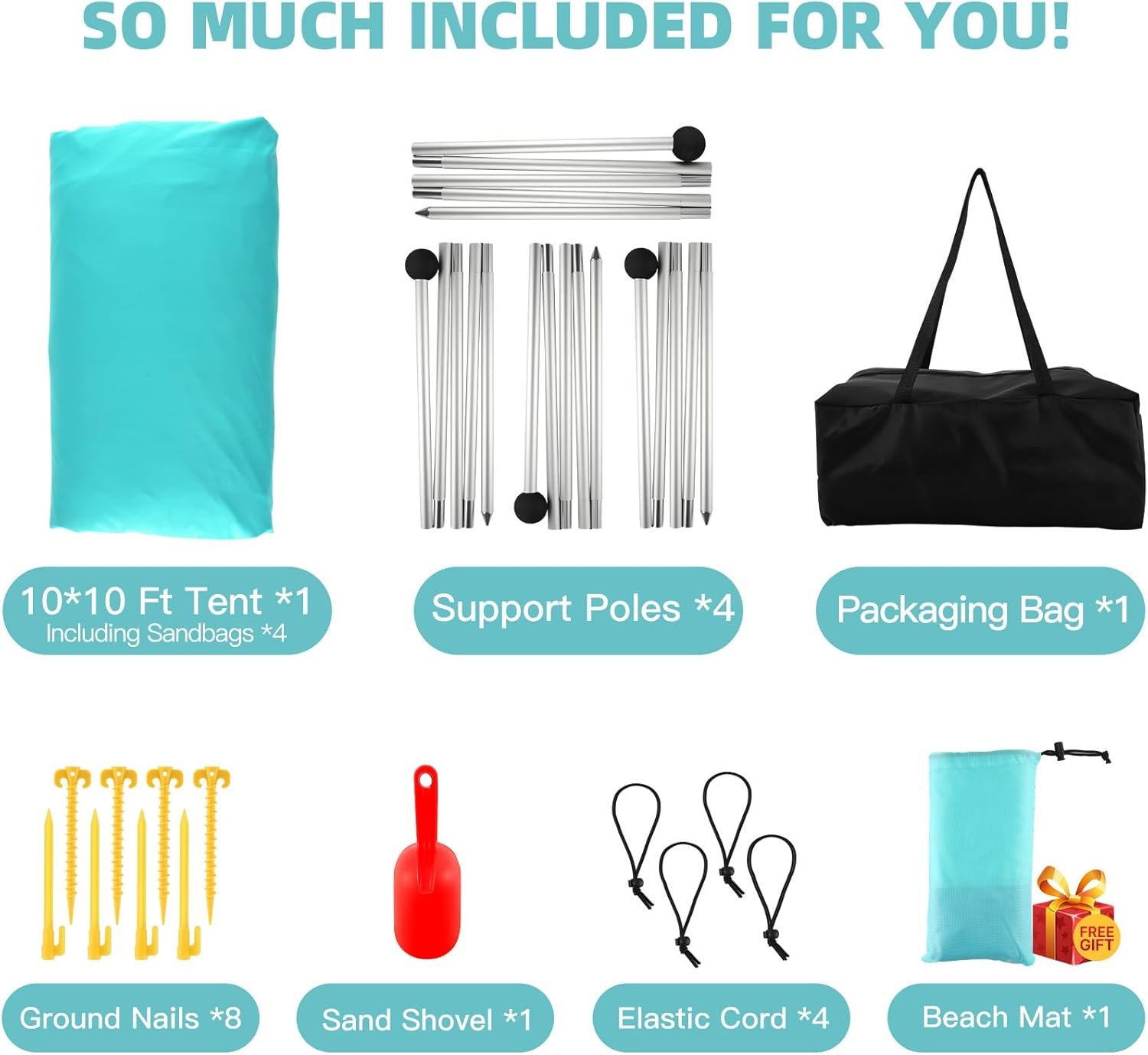 NEW ACCESSORIES INCLUDED: Our upgraded beach shade set adds an extra 7×7 FT waterproof beach blanket and 4 small mat pegs. The original package contains 10×10 ft beach canopy, 1-pack carrying bag, 4-pack aluminum poles, 4-pack ground pegs, 4-pack elastic rope, 1-pack sand shovel, 1-pack user manual. Just bring our tent set and you can go to the beach to experience a wonderful time without buying extra gear