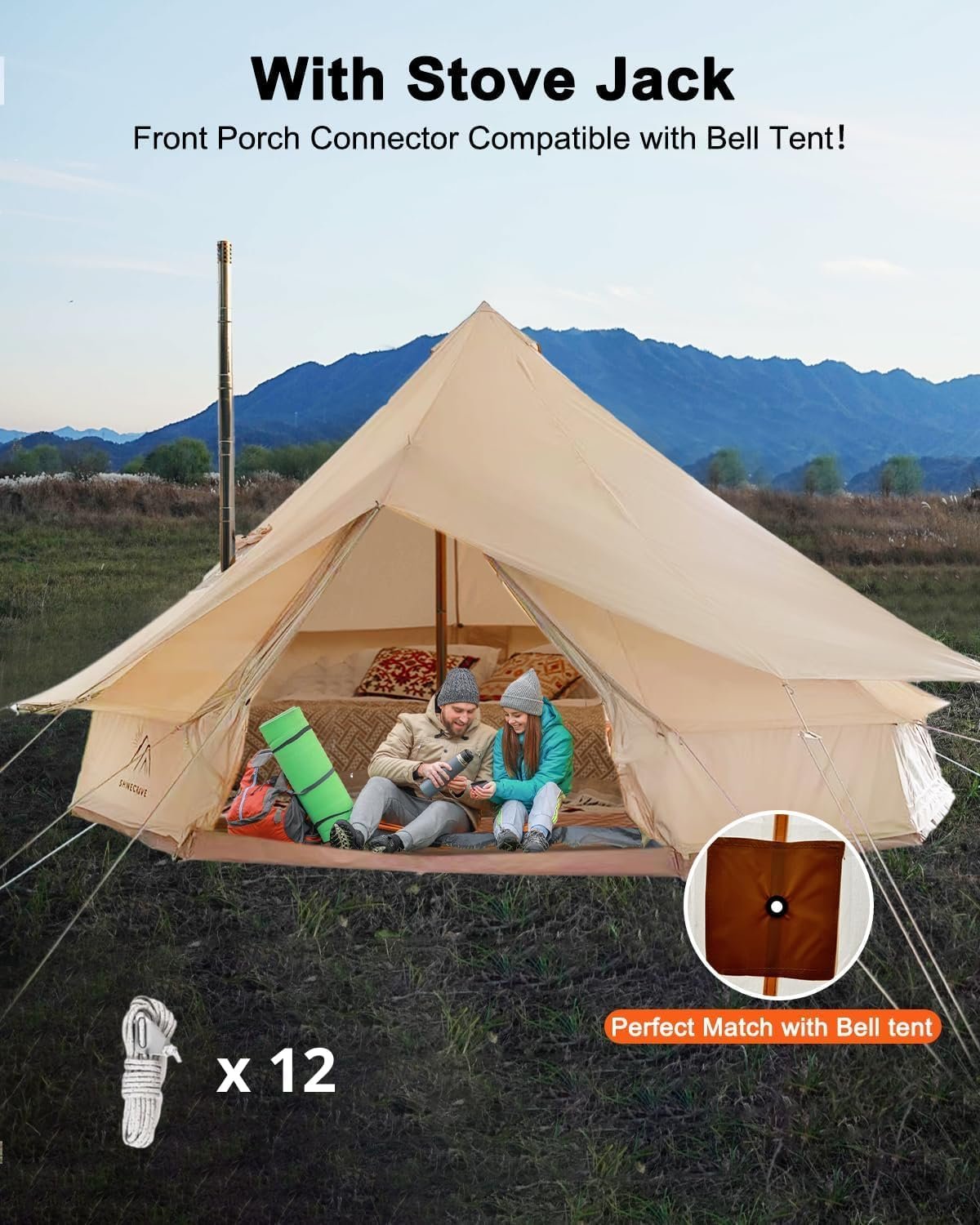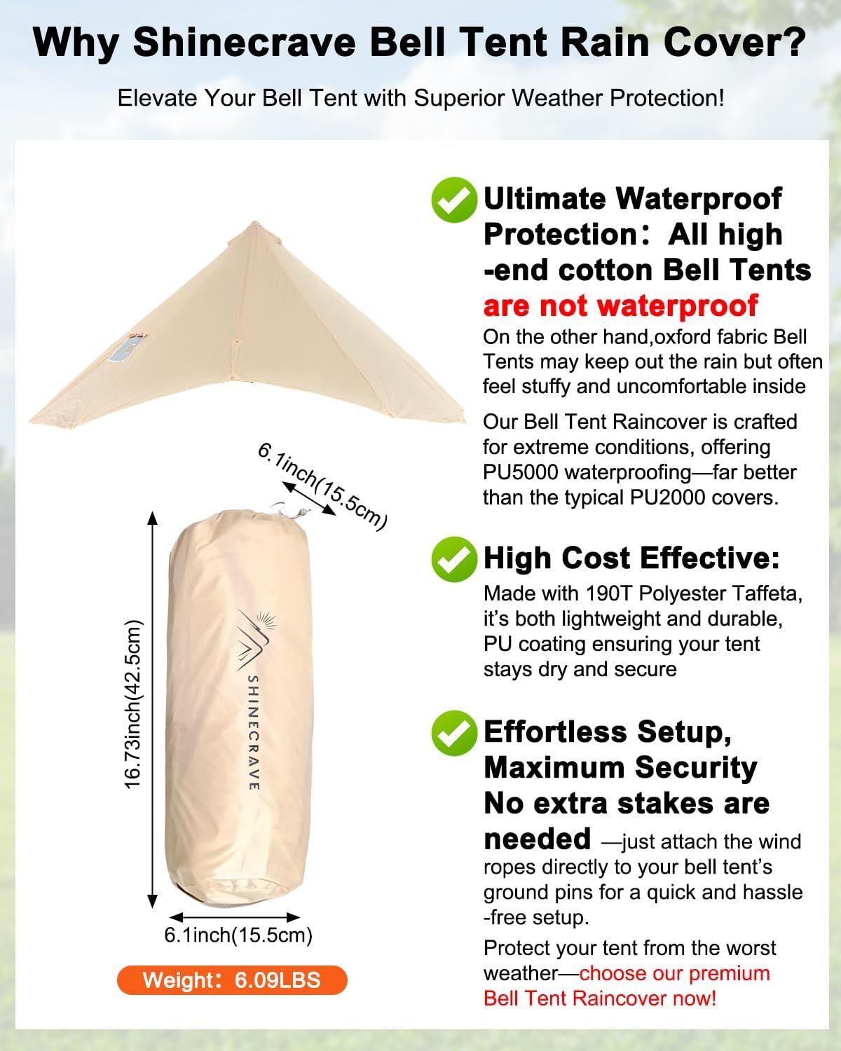 Stove Jack Design: Equipped with a stove jack, the SHINECRAVE bell tent cover allows for efficient ventilation and smoke release, our belltent rain cover ensures a comfortable and safe camping experience,which make the belltent rainfly perfect for camping.