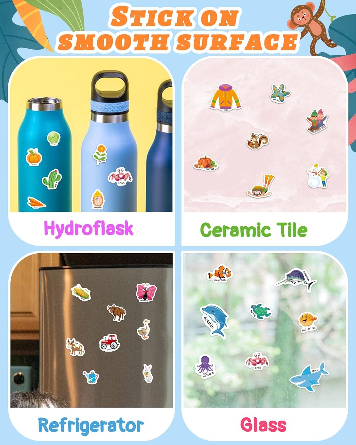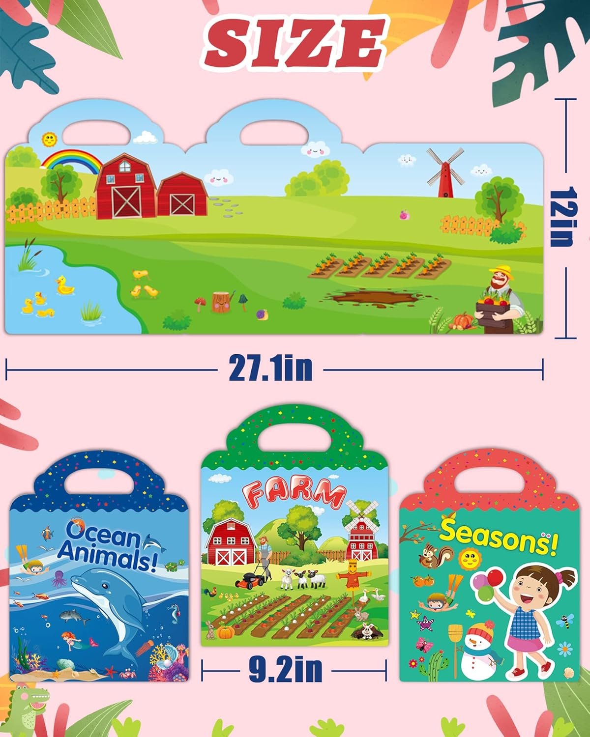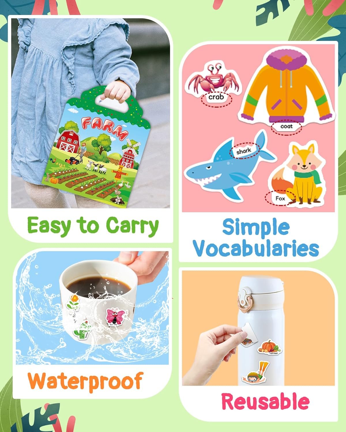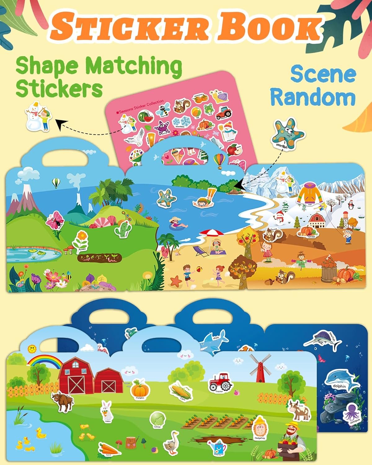 Reusable Stickers for Kids: Sticker book is made with waterproof, reusable PVC material and contains 115 pieces in 3 different themes – ocean animals, farms, and seasons.