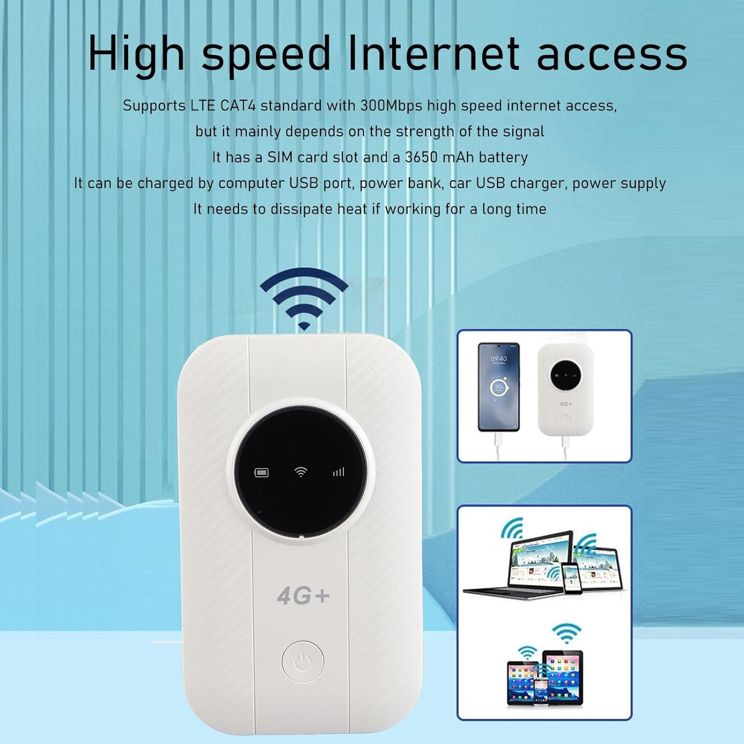 HIGH SPEED INTERNET: Supports LTE CAT4 standard, 300Mbps high speed Internet access, but it mainly depends on the strength of the . It has a SIM card slot and a 3650 mAh battery. It can work with external power supply, no working time limit. It can be charged via computer USB port, power bank, car USB charger, power supply. If it works for a long time, it needs to dissipate heat.