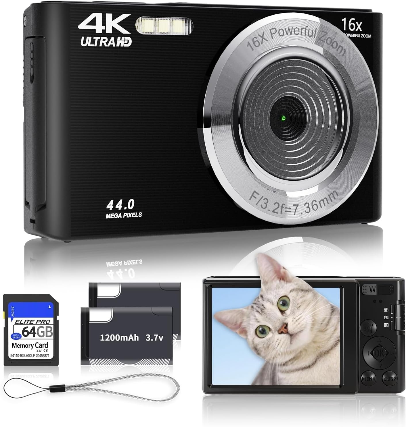 Black Digital Camera 2025 Upgrade 4K 44MP Digital Cameras for Teens, Digital Point and Shoot Camera for Kids with 16X Zoom, 64GB SD Card, Compact Small Camera for Boys Girls Teens Kids Gift