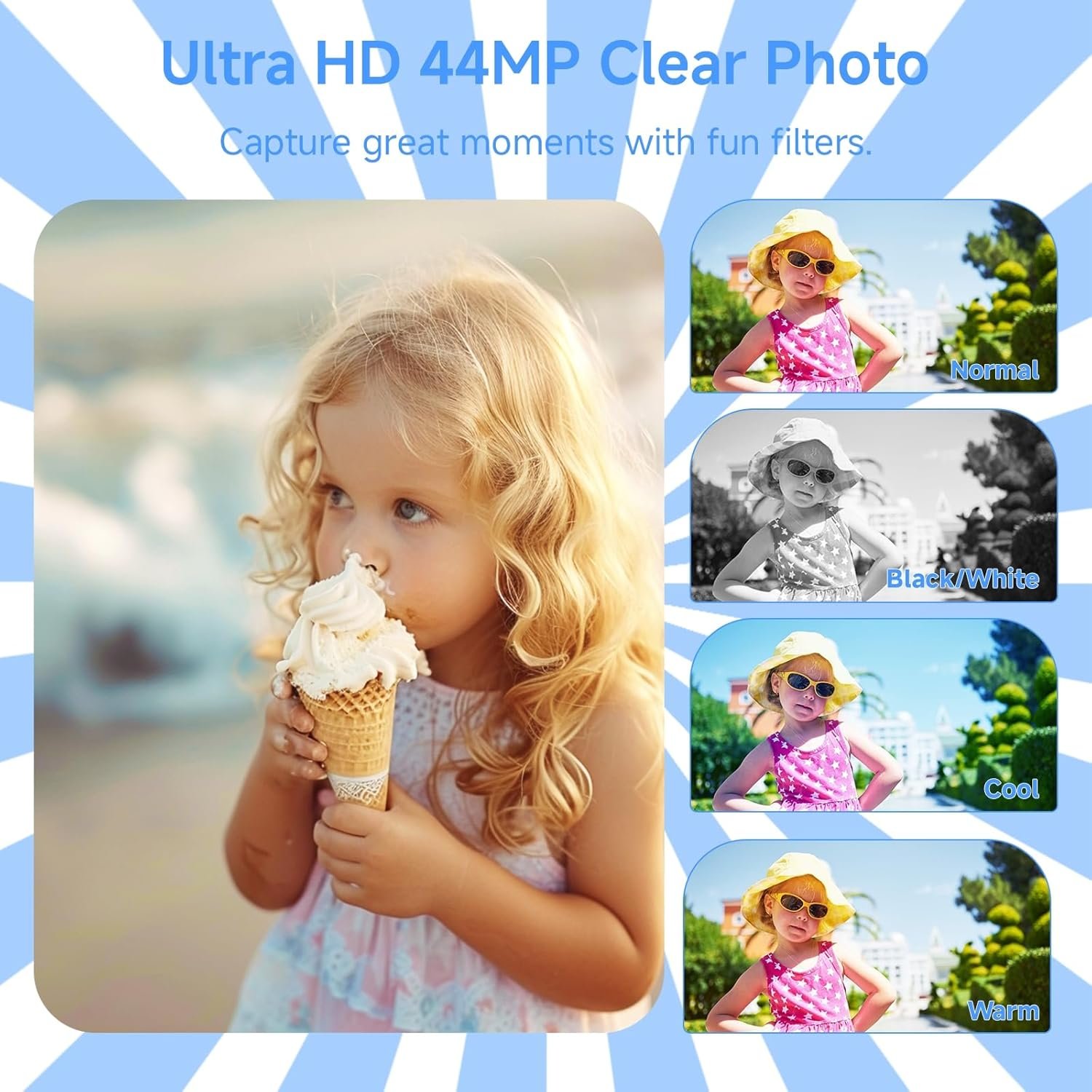 FHD 4K 44MP Camera with 64GB SD Card:The digital camera for kids takes clear 44MP photos and 4K FHD videos. It features a large 2.8 inch UHD display for easy viewing and includes a 64GB SD card, providing plenty of space to save all their favorite moments
