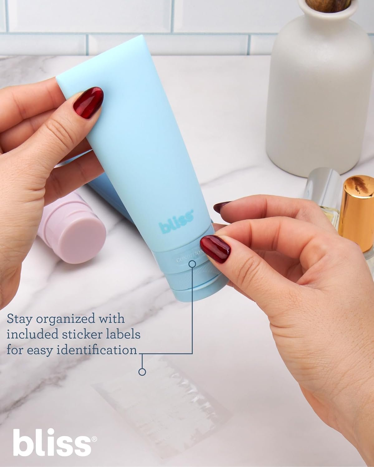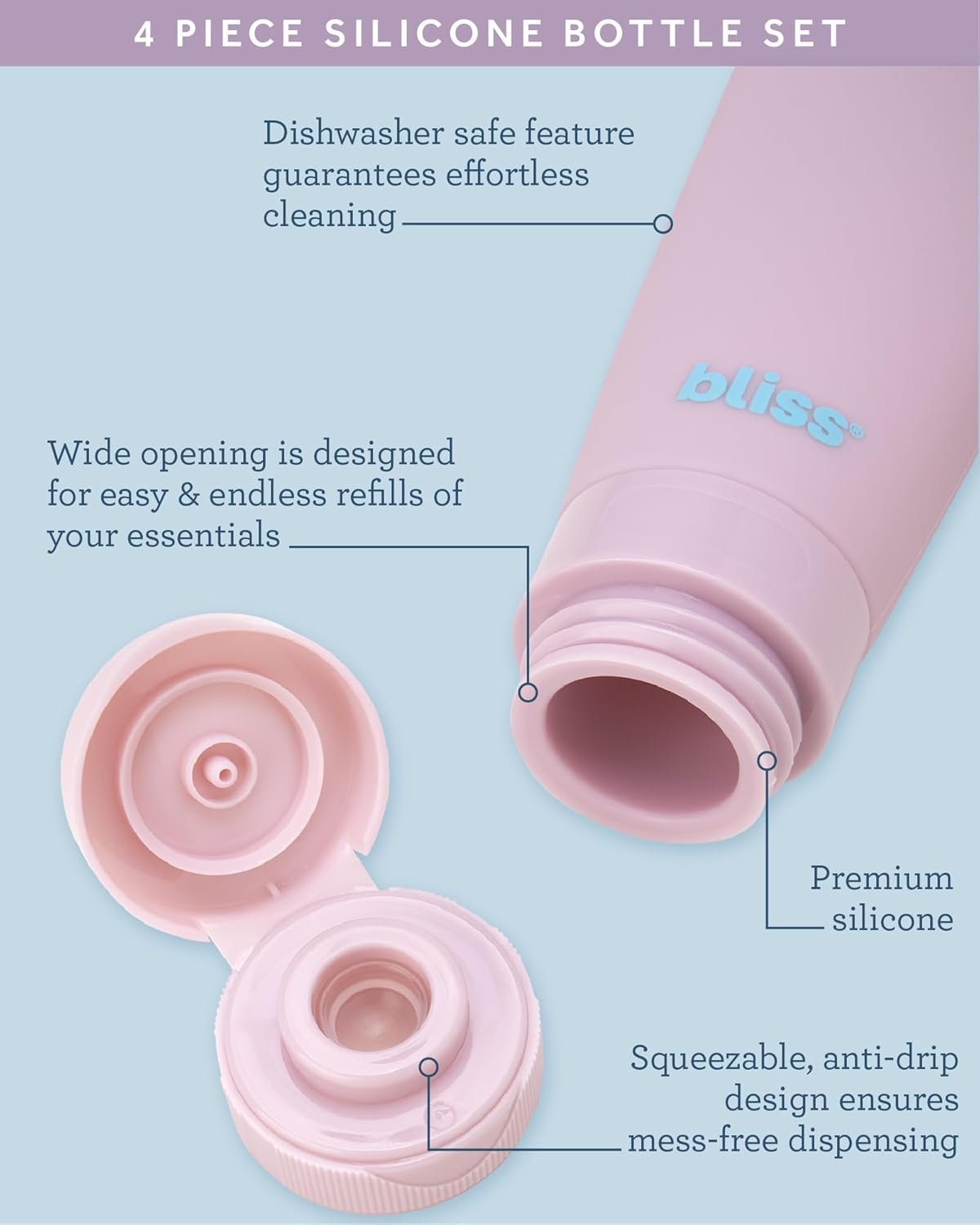 PACK LIGHTER, TRAVEL SMARTER: Keep your toiletries tidy with these bliss silicone travel bottles! Designed for smooth trips, these 3 oz bottles are leakproof, TSA-approved, and great for travel essentials like shampoo, conditioner, lotion, and body wash. Whether you’re flying across the globe or hitting the gym, their compact size and squeezable silicone make packing liquids a breeze.