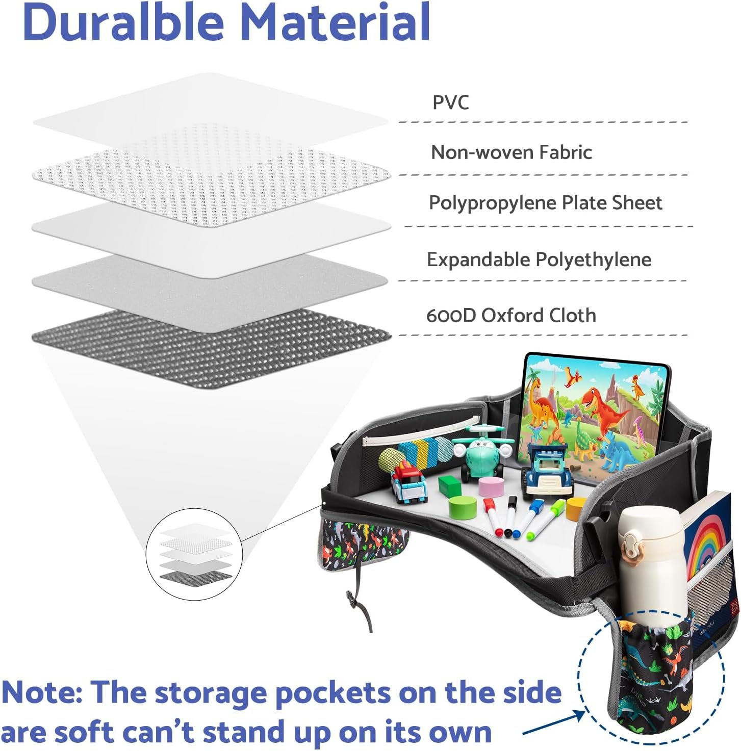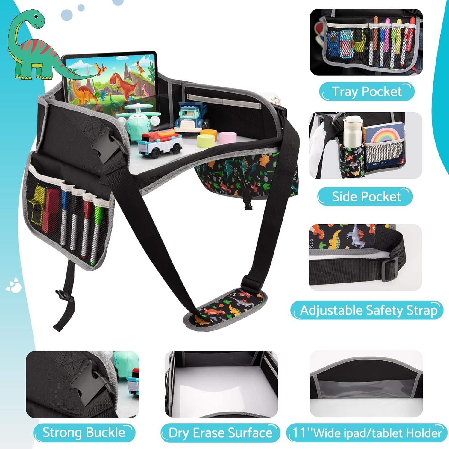 The car tray has a wipeable panel and storage pockets, which can be used for drawing, eating, watching tablet, playing with toys, and also for organizing the child’s toys, pen, cups, and hold an iPad.