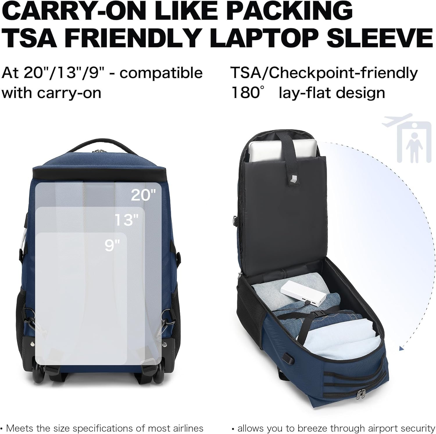 TRAVEL COMPANION: This backpack with wheels is convenient for security checks, it is designed to meet most airline carry-on baggage requirements and fits easily into the overhead rack. Its multi-purpose design provides convenience for student parties and business travelers, this classic multi-functional backpack is the best choice for students and travelers for roller backpacks, college student backpacks with wheels, and business rolling backpacks