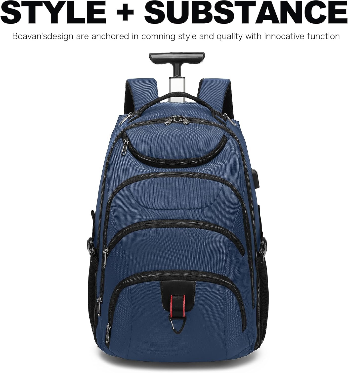 DURABLE MATERIAL: This rolling backpack is made of premium waterproof Oxford fabric that is both attractive and sturdy, with two-way YKK zippers. And there is a height-adjustable smooth aluminum hidden retractable handle with two sturdy, wear-resistant and silent rubber rollers for easy use on different surfaces. Equipped with an adjustable padded shoulder strap and with no mobile power USB, it brings convenience to your traveling