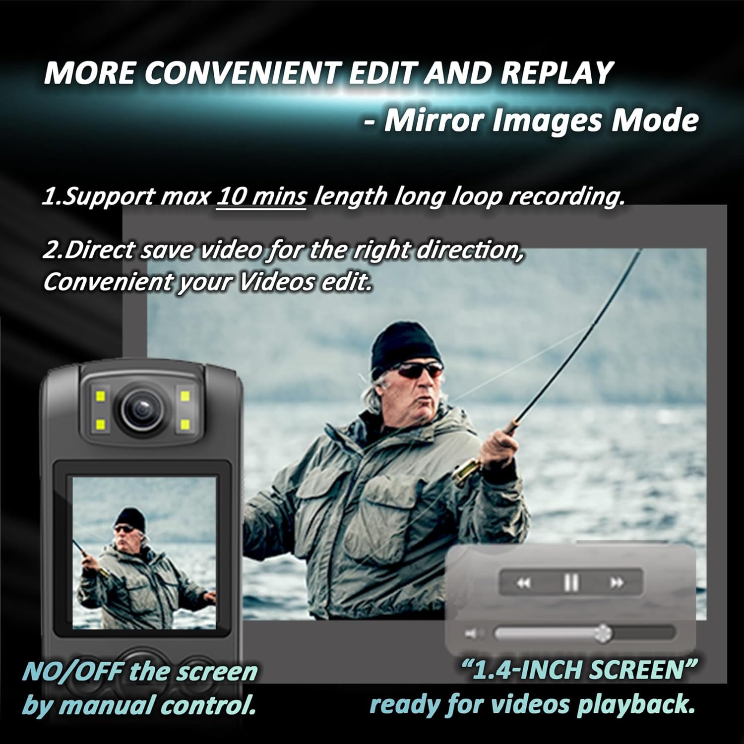 【6 HR Battery life/128GB & One Key Start Recording / No LED Recording Mode / Mirror Mode】The Body Camera with Equipped with a 1300 mAh rechargeable battery, that can last almost 6 HR working time, also supports 24/7 recording when connecting the power bank/power, helps you keep an eye on everywhere. Equipped with the one key compulsory recording mode, No worry about mistaken button-press & Auto hidden LED indication, instantly start your record. Offering Mirror Mode for inverting right and left.