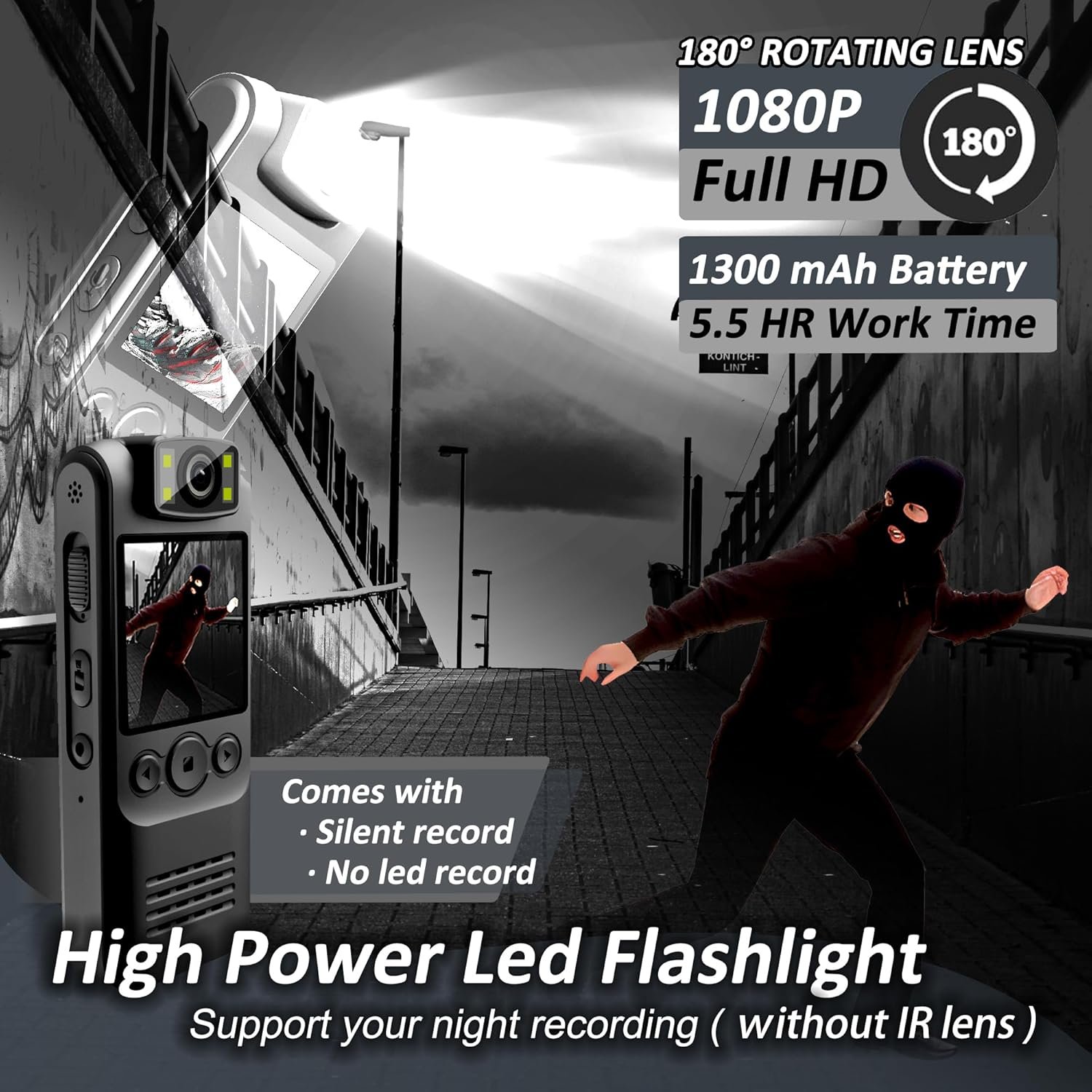 【180° Rotatable -120° lens & Motion Detection /Flashlight Mode】 Body camera with a 180° rotatable /120° lens that can adjust the lens direction to your demand, ensuring the cam will not record at a wrong angle, miss the important evidence. Motion detection can help you save more power and memory space when you don’t need to record all the time. No matter place & and day/night the bodycam’s 4 pcs fill lights can light where you are, offering you a colorful night recording under light [No IR lens]