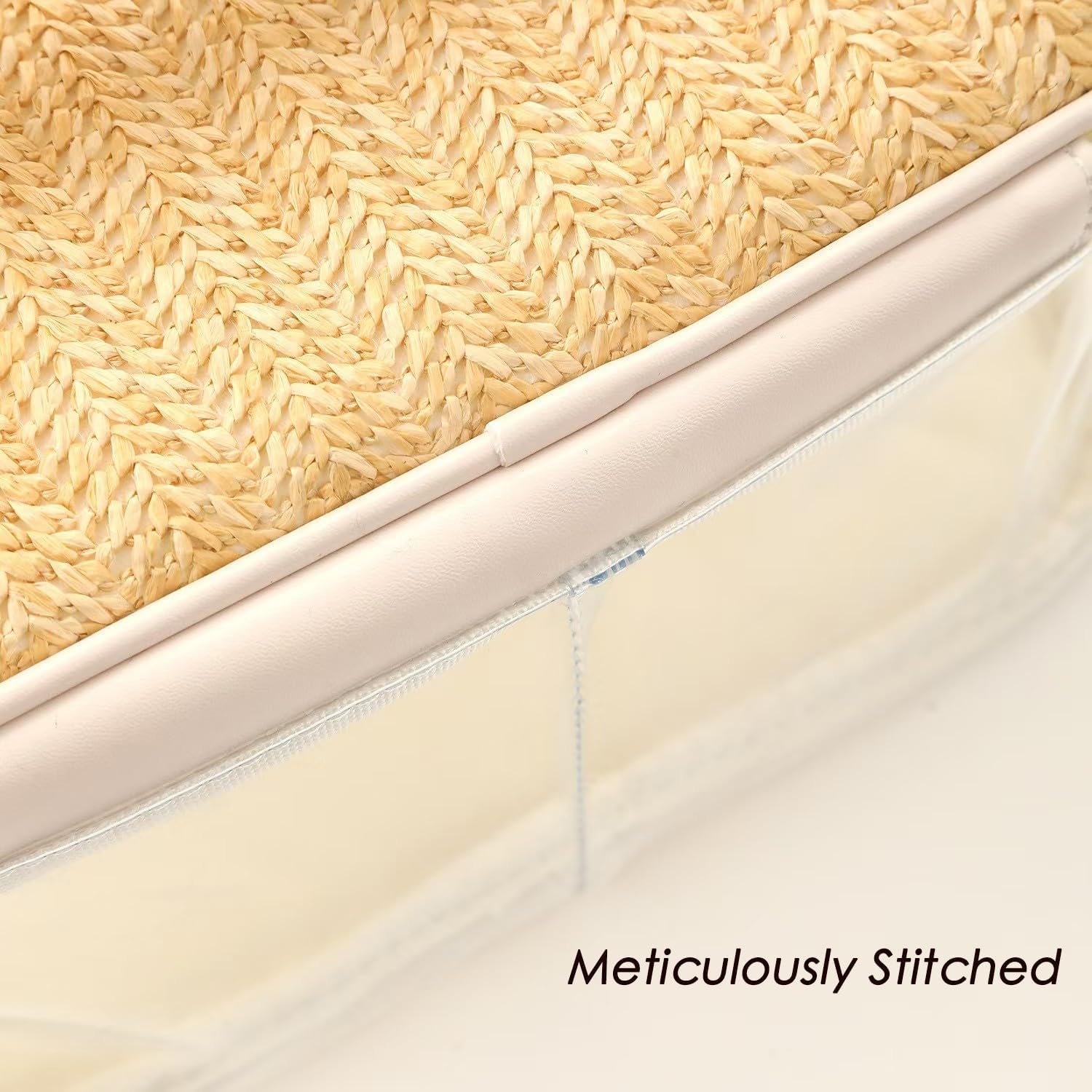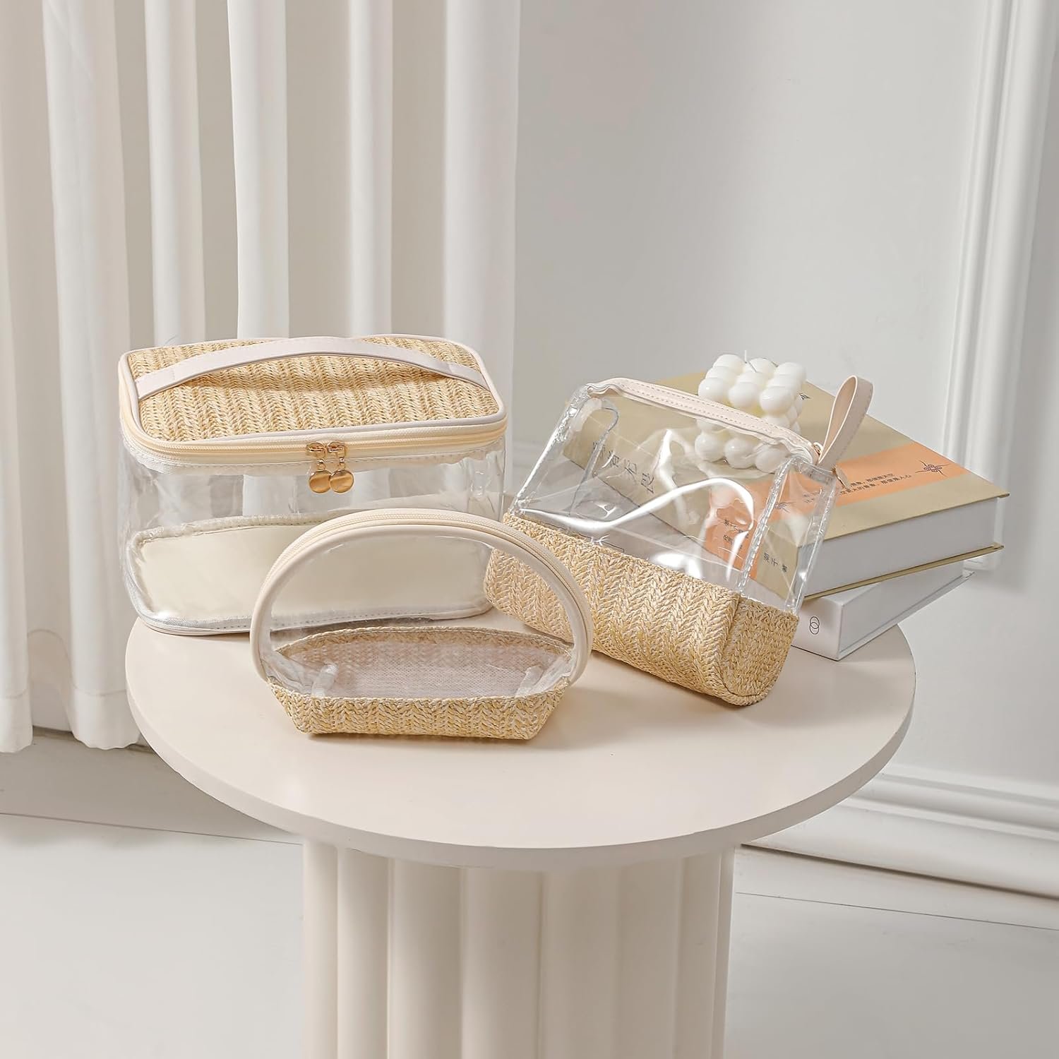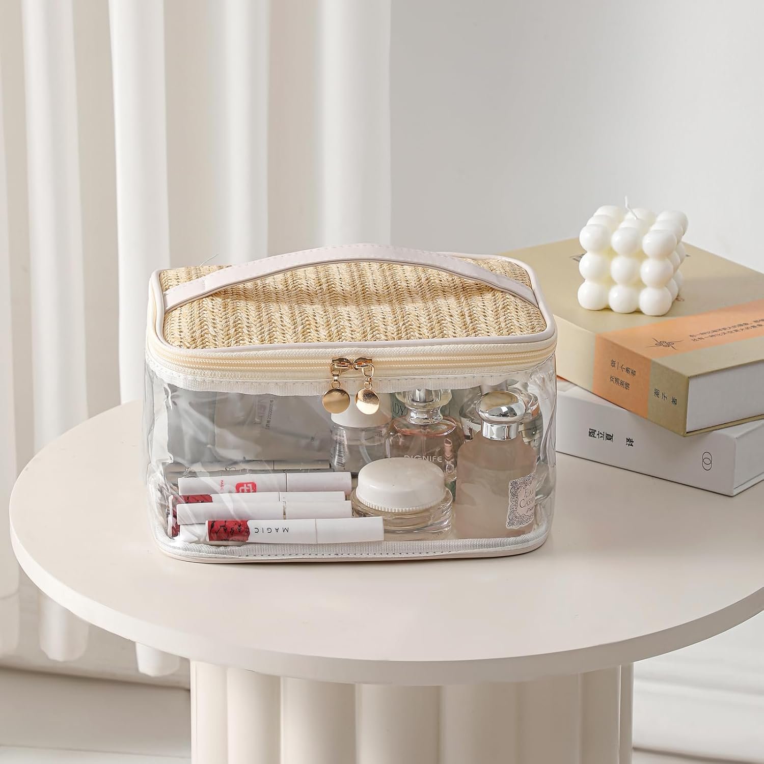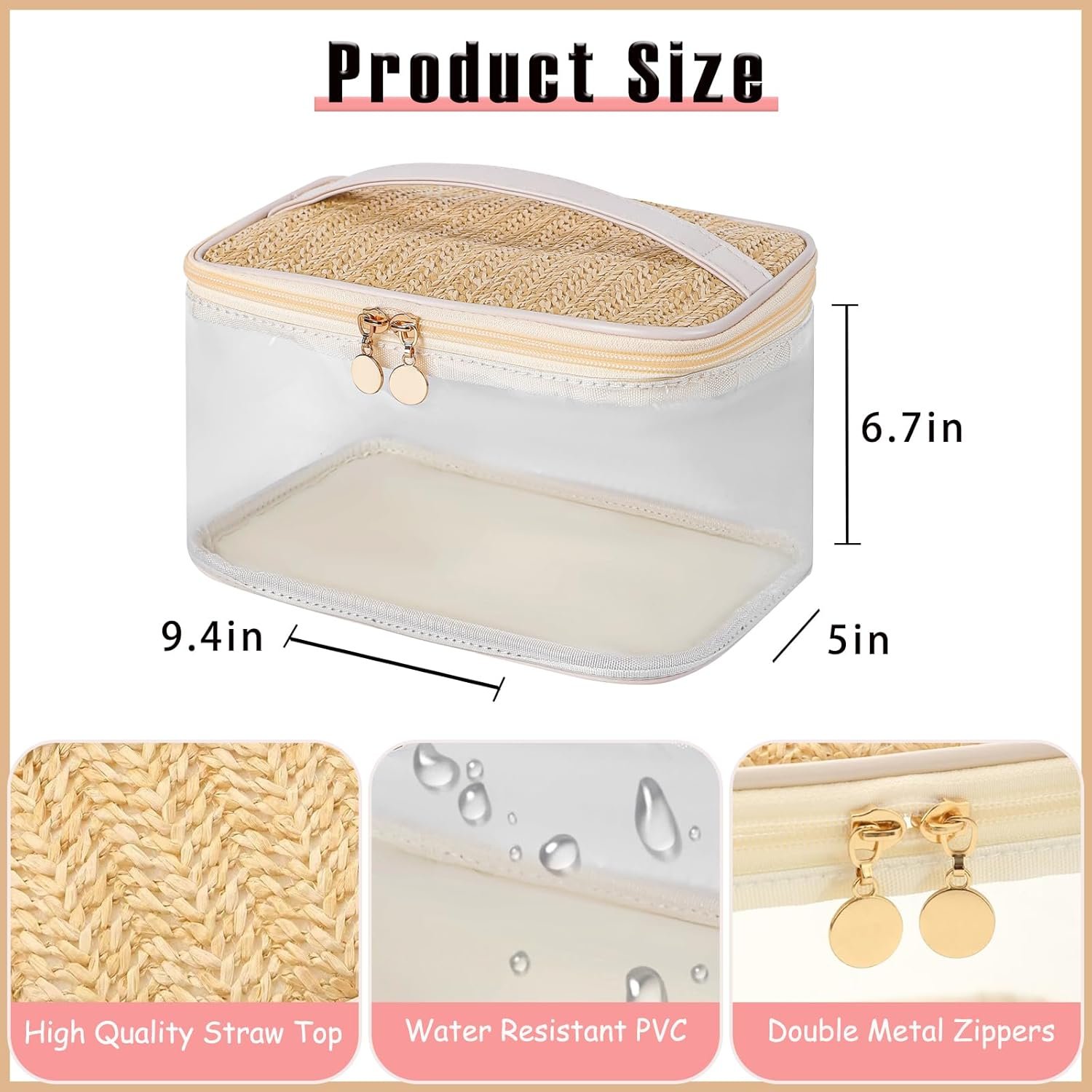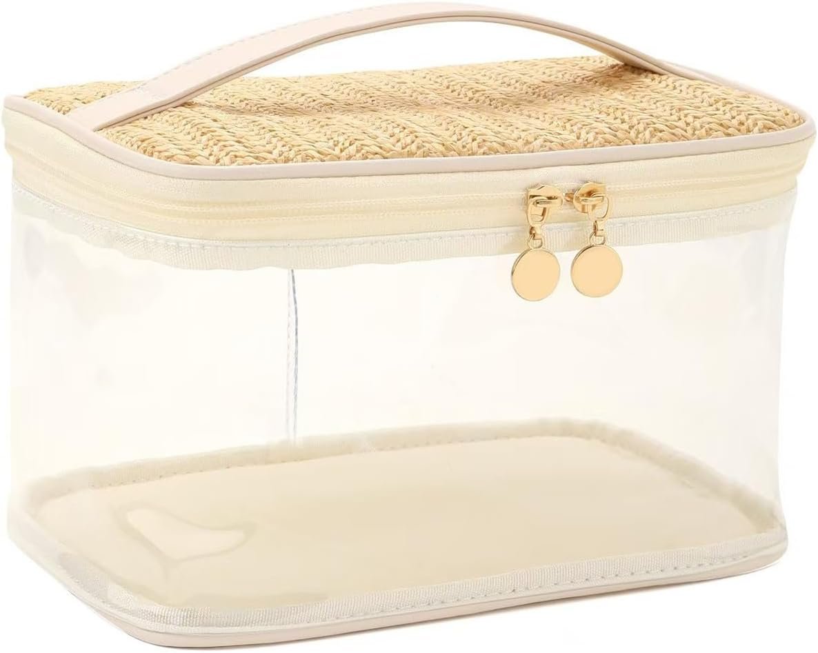 Boho Large Clear PVC Waterproof Makeup Bag with handle, Transparent Zipper Cosmetic Bag for Travel, Beach Bag for Sun screen Skincare (01Large size-Beige)