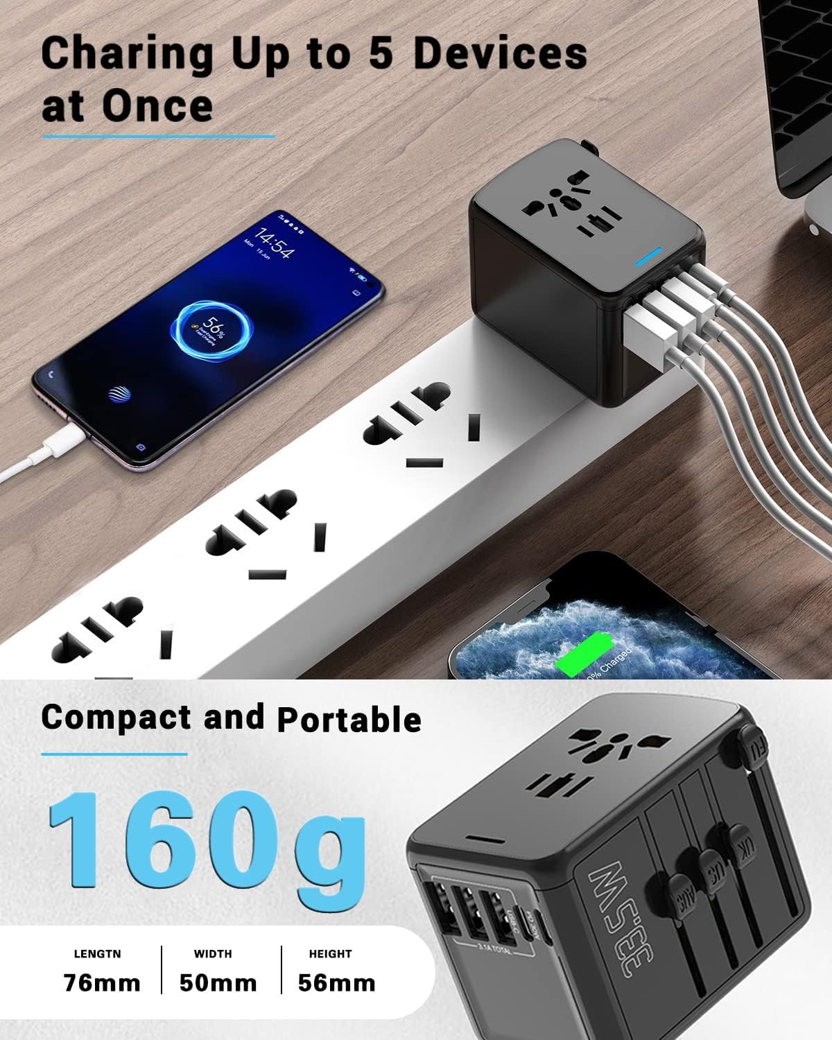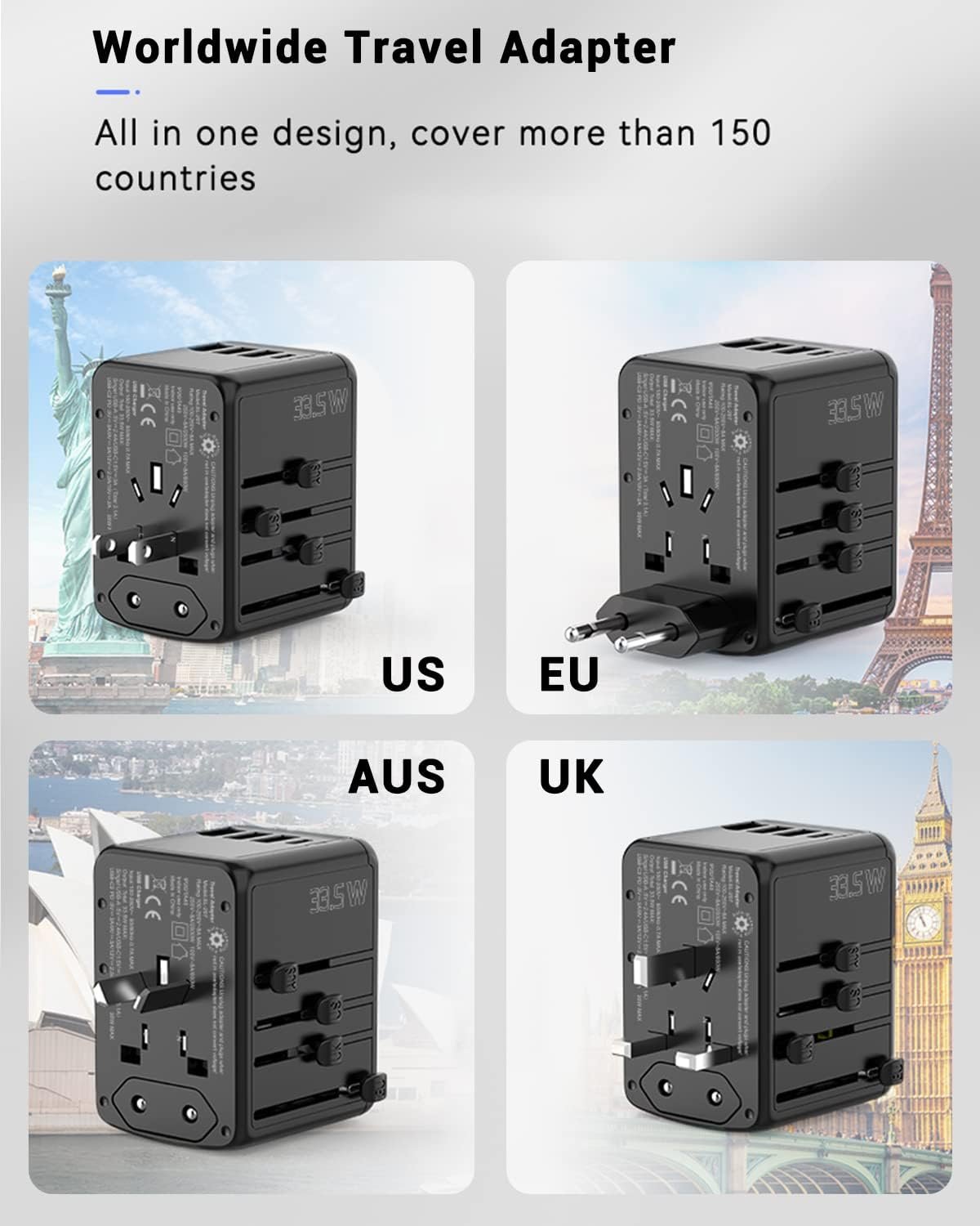 【Worldwide Adapter 】The All-in-one world multi-function Travel Adapter that covers more than 150 countries, such as America, the UK, Europe, Australia, The USA, Italy, Japan, China, and France, Africa, Sweden, Singapore, Netherlands, Portugal, America, etc. Small and lightweight, perfect for your worldwide traveling.【 NOTE】The adapter is NOT a voltage converter, please make sure that the devices that you will be using with our travel adapter all have dual or variable-voltage capabilities.