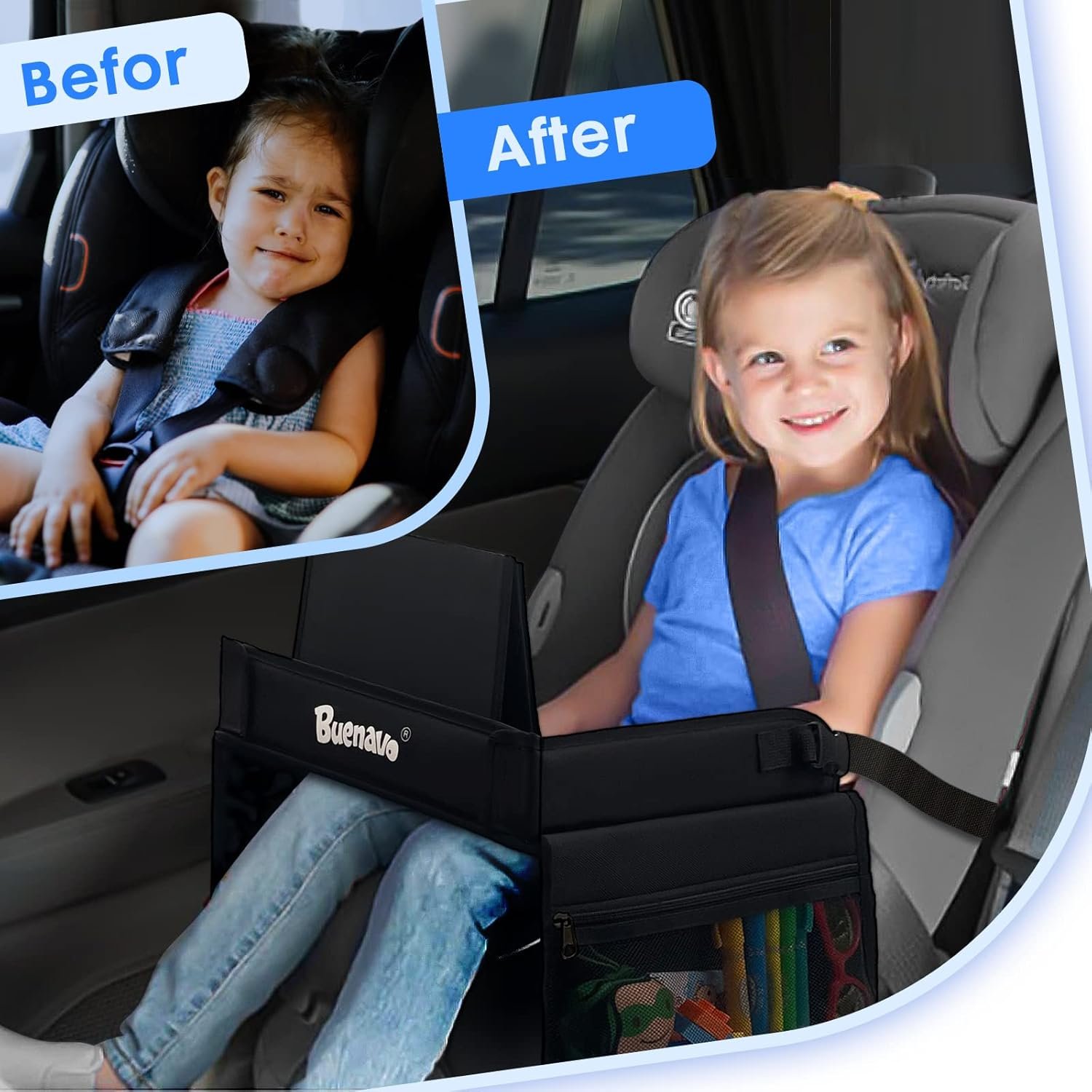 Buenavo Kids Travel Tray helps those who spend long hours on the road to put stress of travel behind! Kids will have hours of entertainment by using the sturdy desktop surface or slipping an electronic tablet into the secure bag for hours of watching movies and shows. We provide a sturdy (but not rigid, for safety reasons) surface that’s ideal for activities like snacking, playing with toys, drawing! storage pockets are perfect for stashing crayons, paper, treats & cards. Kids keep their belongings at their fingertips, not on the floor!