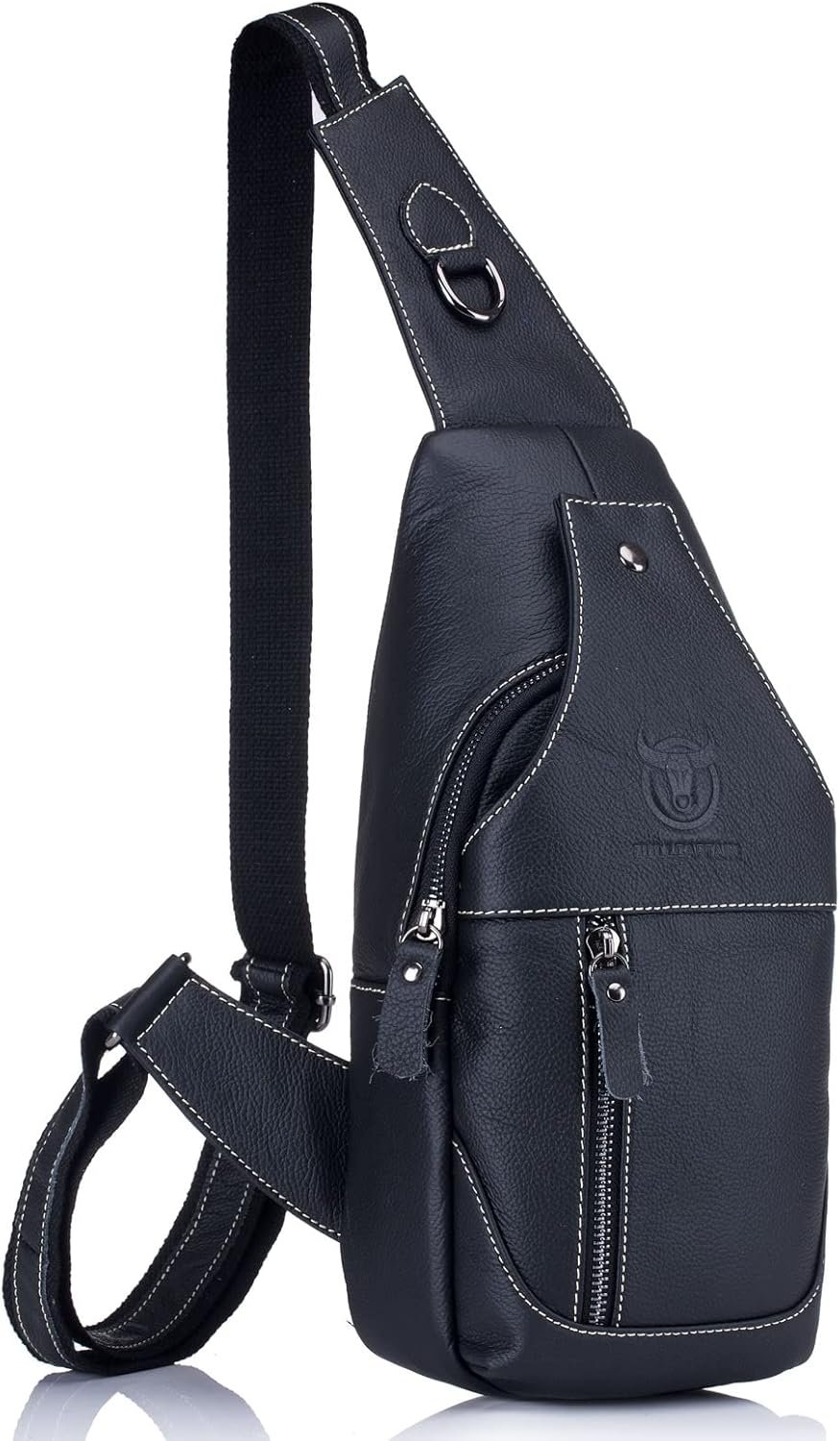 BULLCAPTAIN Leather Men’s Sling Backpack Multi-pocket Crossbody Chest Bags Travel Casual Backpack with Earphone Hole (Black)