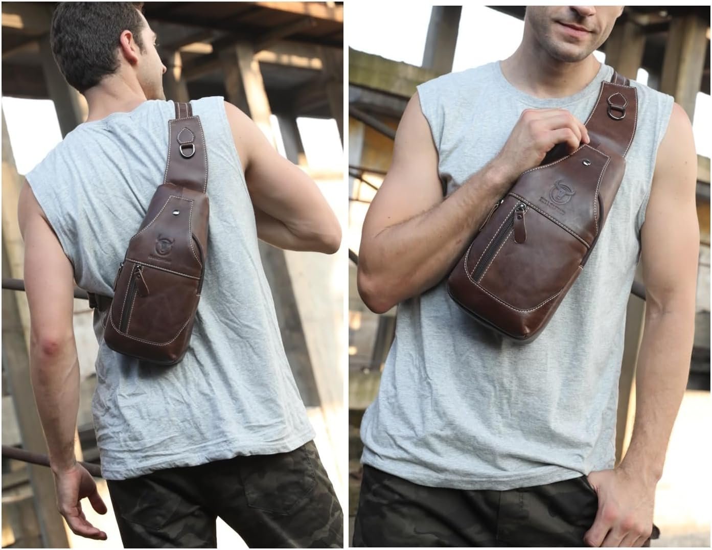 〔GENUINE LEATHER〕: sling chest bag is made from hand-crafted retro genuine leather with soft and durable, comfortable.delicate and clear textures elegant appearance!It is a fashionable durable and lightweight small sling chest bagwith excellent bearing capacity.
