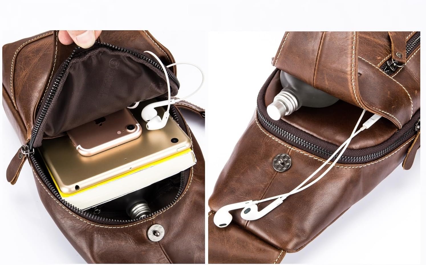 〔IDEAL APPLICATION〕: This leather sling chest bag with a with headset cable hole,you can listen to your favorite music by connecting the headphone directly to your sling chest bag during outdoors and travel.Perfect for business ,outdoor, hiking, camping,travel and work etc.It also a great present for a birthday, anniversary, valentine’s day,father’s day.Perfect for business professionals or travelers want to make a fashion statement and also a good gift for your family.