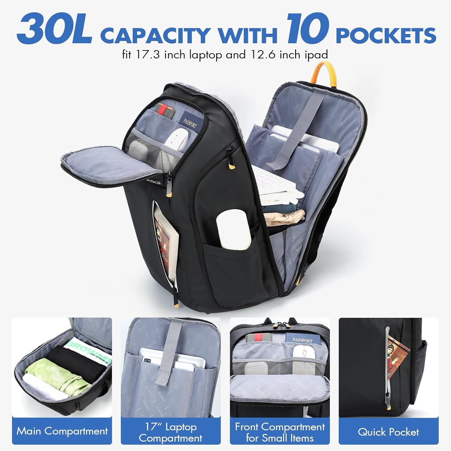 SPACIOUS & ORGANIZATION: Mens laptop backpack 30L large capacity to meet of 1-3 days short trips, with a dedicated 17 inch laptop compartment, includes front quick-access pockets and side water bottles and USB charging port, back-in anti-theft pockets keep valuables secure