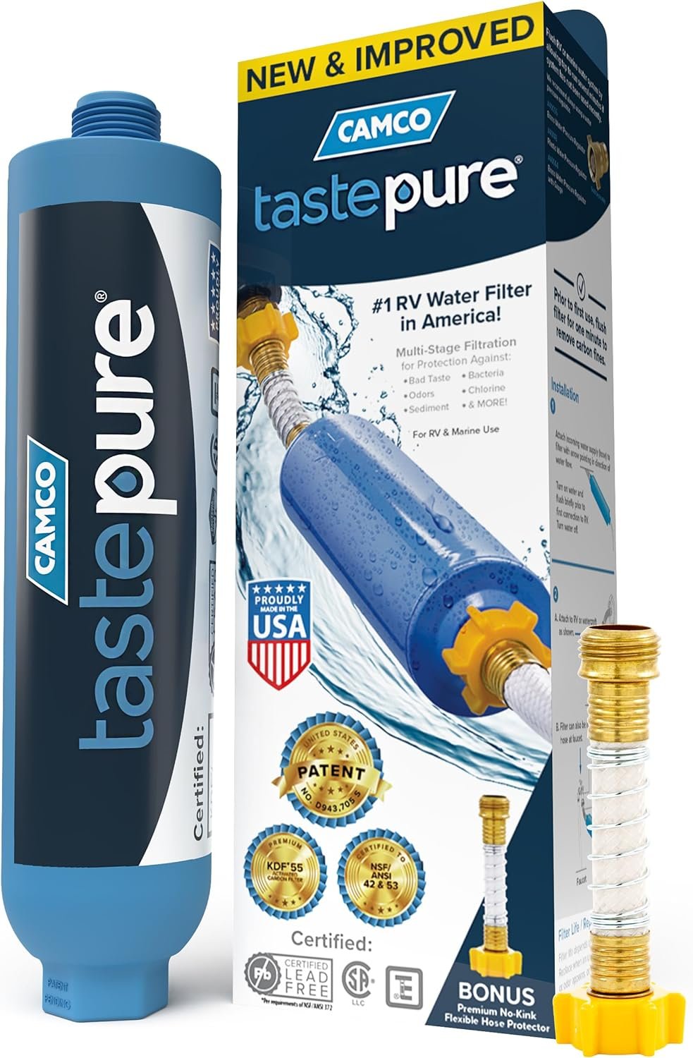 Camco Tastepure RV Water Filter – New & Advanced RV Inline Water Filter with Flexible Hose Protector – GAC & KDF Water Filter – Made in USA – Camping Essentials for Fresh Drinking Water (40043)
