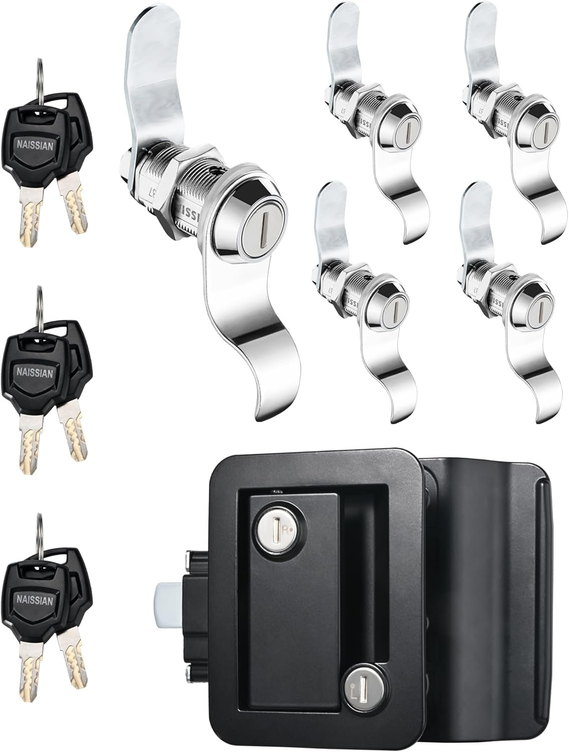 【All Keyed Alike In A Set, Say Goodbye To Unnecessary Different Keys】This black camper door lock & 1-1/8″ cam lock set will come with all keys the same. Naissian is the only one brings 2 different kinds of lock could be opened by same key. 2 kinds of lock have same lock face, 1 key could open both camper door lock and small cam lock in a set. Such a convenience design for your no need to carry extra different keys.