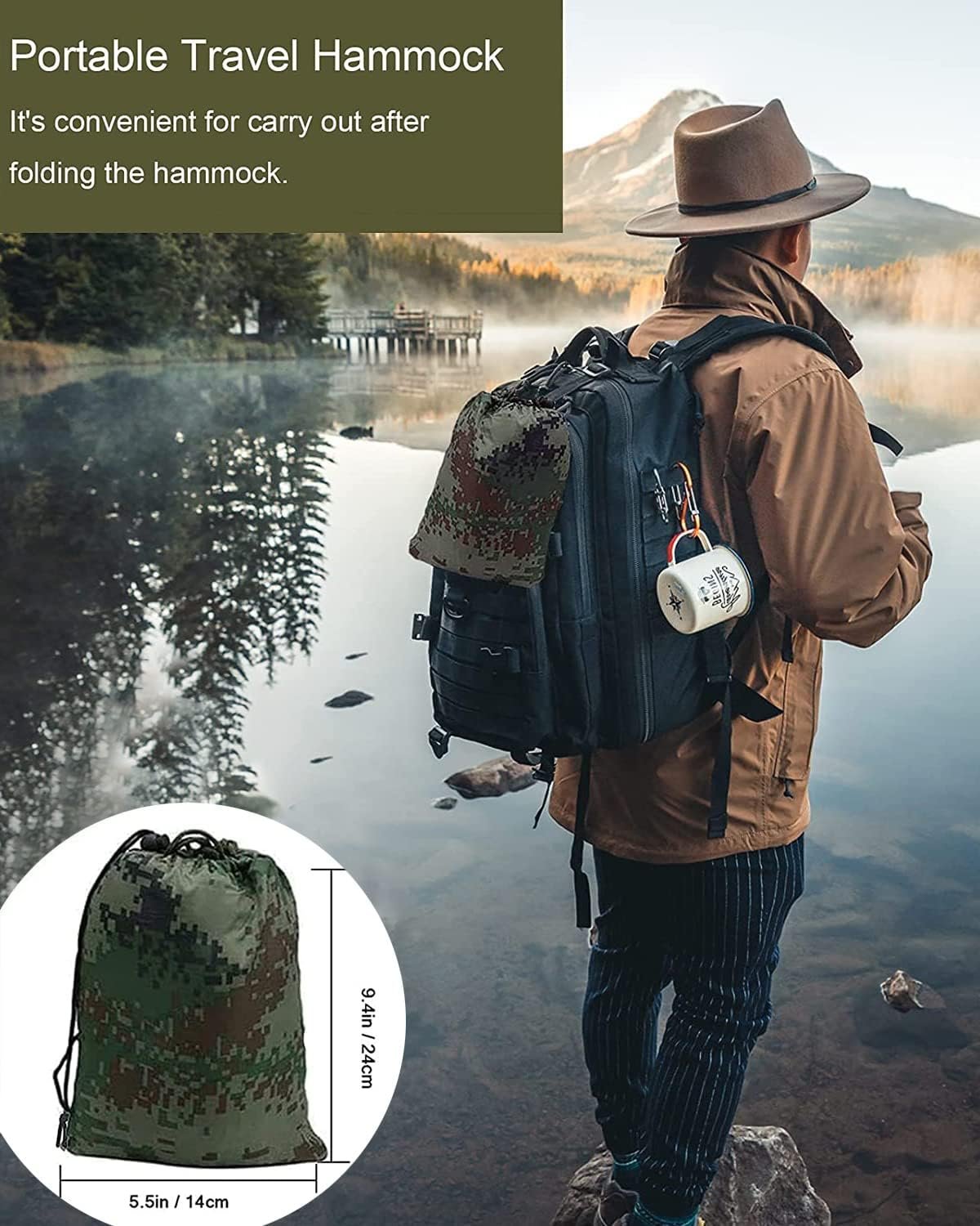 LIGHT WEIGHT & PORTABLE: This Outdoors Hammock weighs only 1.5 lbs, you can take it anywhere. It can be in storage in the small bag (5x5x9 inch) for maximum portability. When you take the hammock out, this bag also can be used to store small items. Ideal for solo adventures, camping, hiking, backpacking, travel, emergency. This lightweight portable hammock is designed to meet your most demanding camping needs