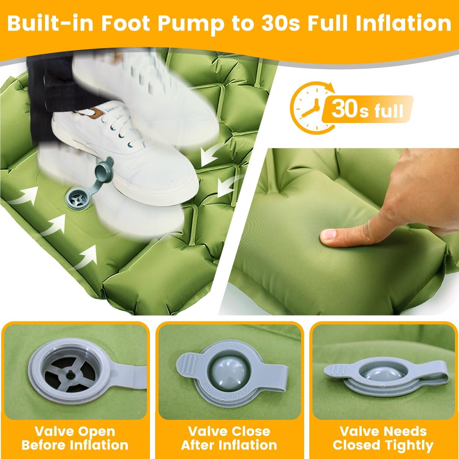 Our camp mat have a built-in foot pump, inflating with the foot pump can take as fast as 30 seconds to fill, working efficiently to inflate quickly and easily. Deflating efficiency is also fast, fully pull open the air valve on the back of the built-in pillow and deflate instantly.