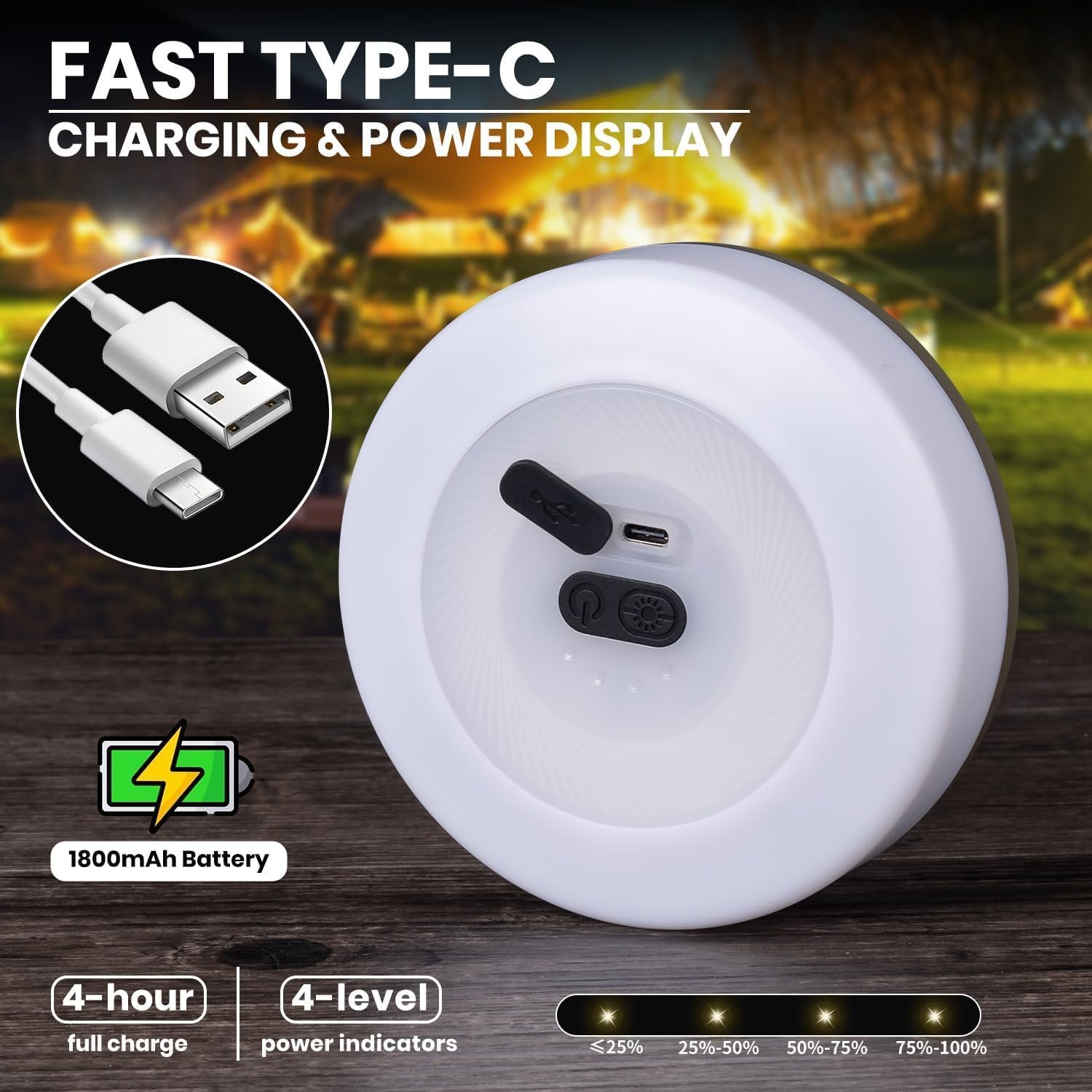 USB Rechargeable: Built-in a 1800mAh rechargeable battery, 4 hours USB-C fast charging(cable included), the outdoor string lights can light up 2h – 21h when fully charged. 4 power indicators show the battery charge level, charging it timely.