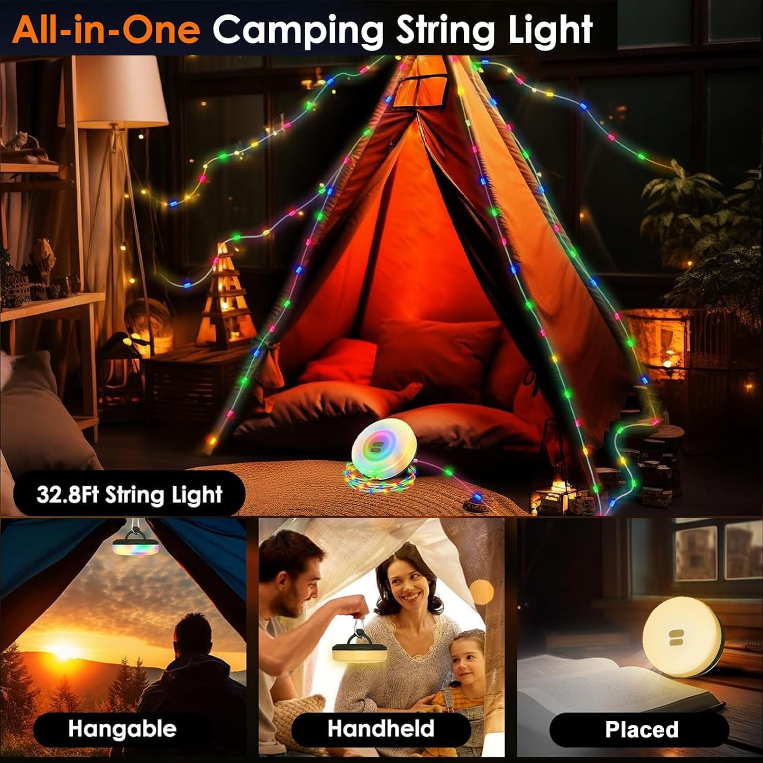 Camping String Lights, Camping Essentials Gear 32.8FT Lamp Lights Waterproof, 3 in 1 Outdoor String Lights with 7 Modes for Awn Tent Yard Garden Hiking Travel Decoration and Holiday Christmas Gift