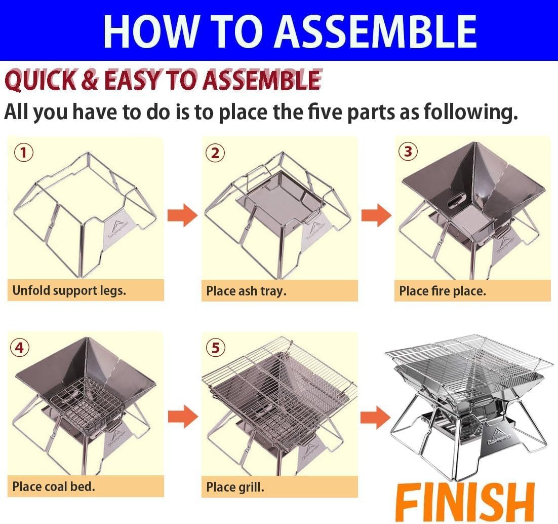This portable camping grill is easy to assemble as shown in the above picture, and it is also easy to fold it into the storage bag.